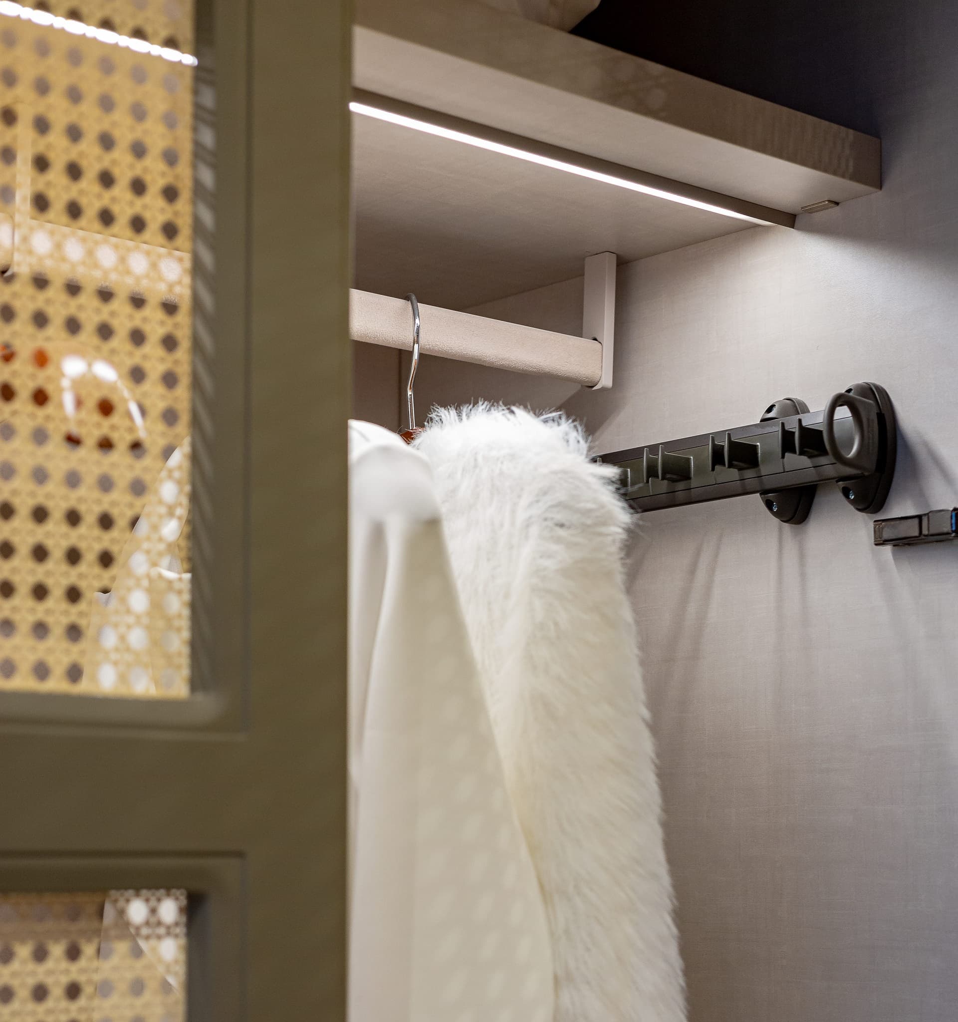 O porta lenços extraível otimiza espaço e organiza de maneira prática e elegante os acessórios do vestuário. Um produto genuinamente italiano com alto nível de aprimoramento técnico e estético, produzido em alumínio anodizado e partes em nylon com fibra de vidro, garantindo qualidade e resistência. O deslizamento suave e preciso está disponível nas cores marrom e branco.