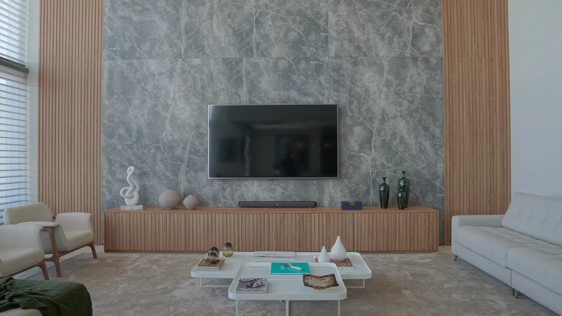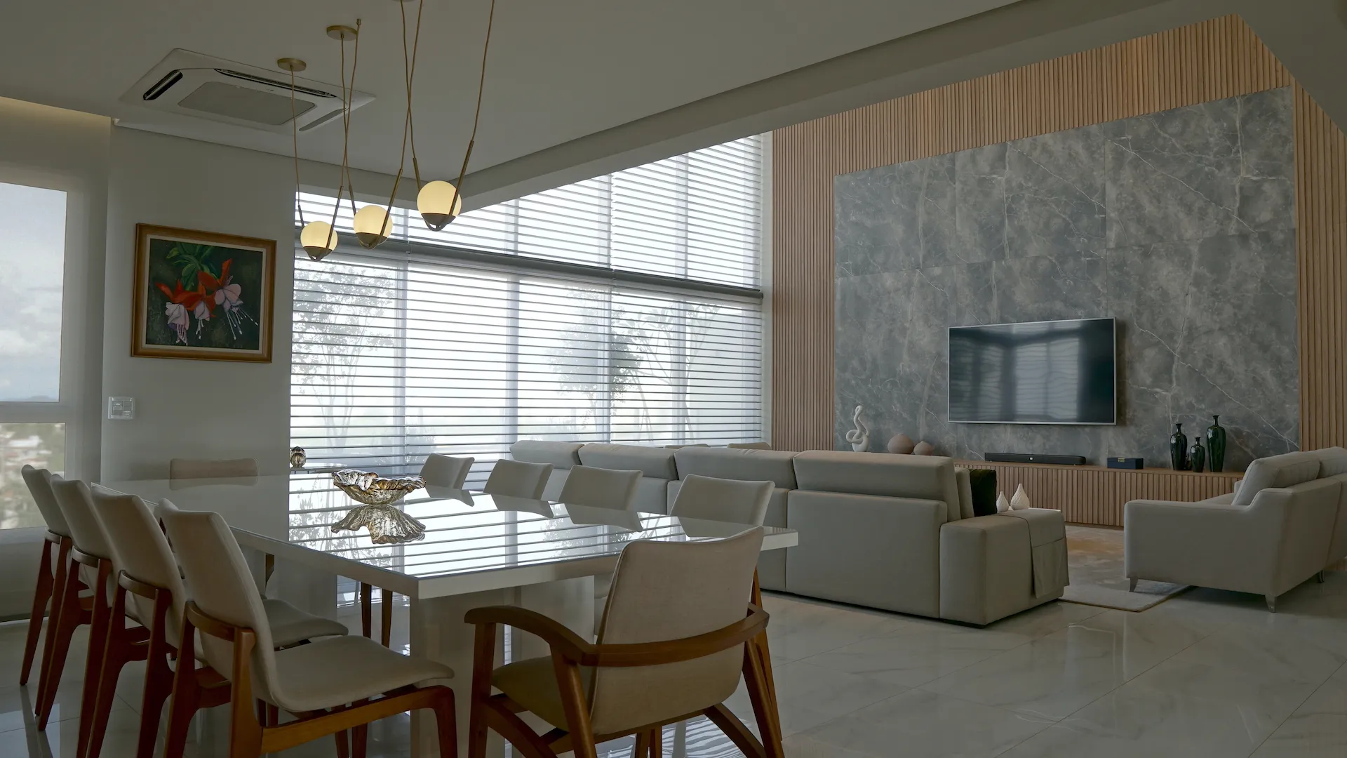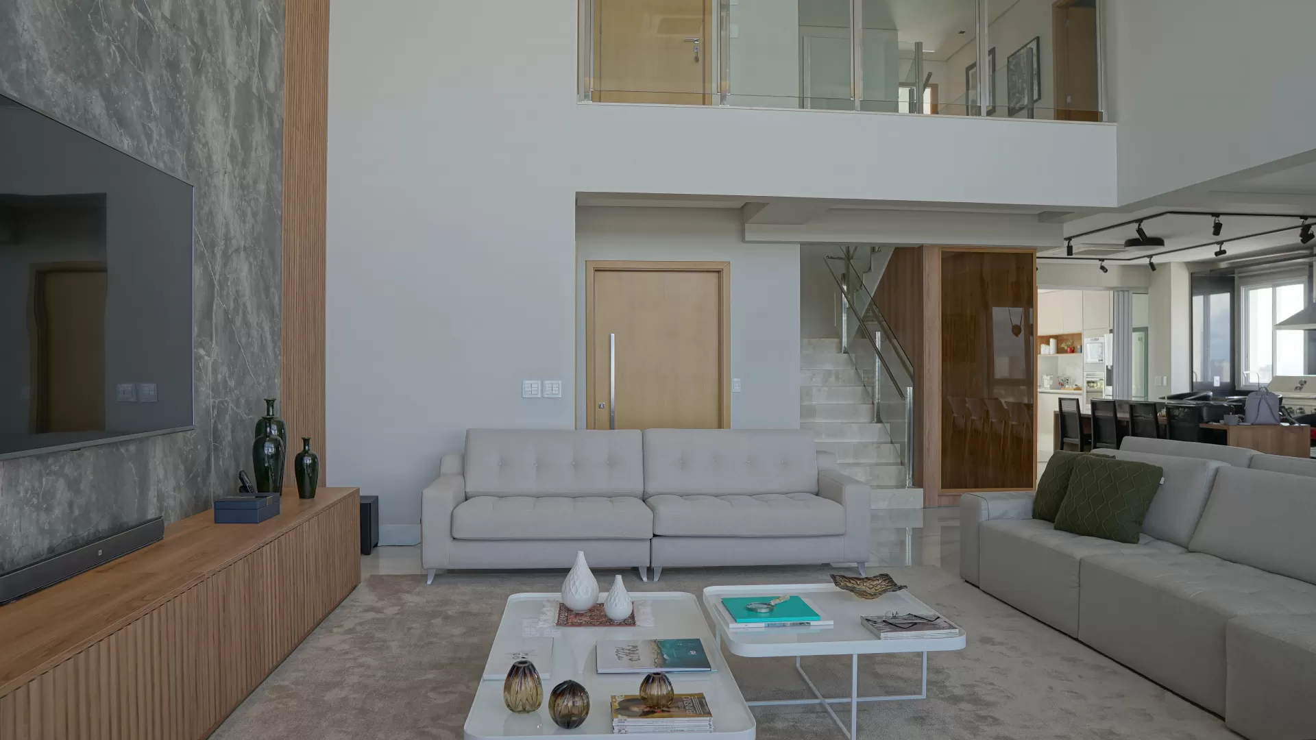 O living transmite acolhimento, delicadeza e nobreza, oferecendo um refúgio a todos que compartilham o lar.