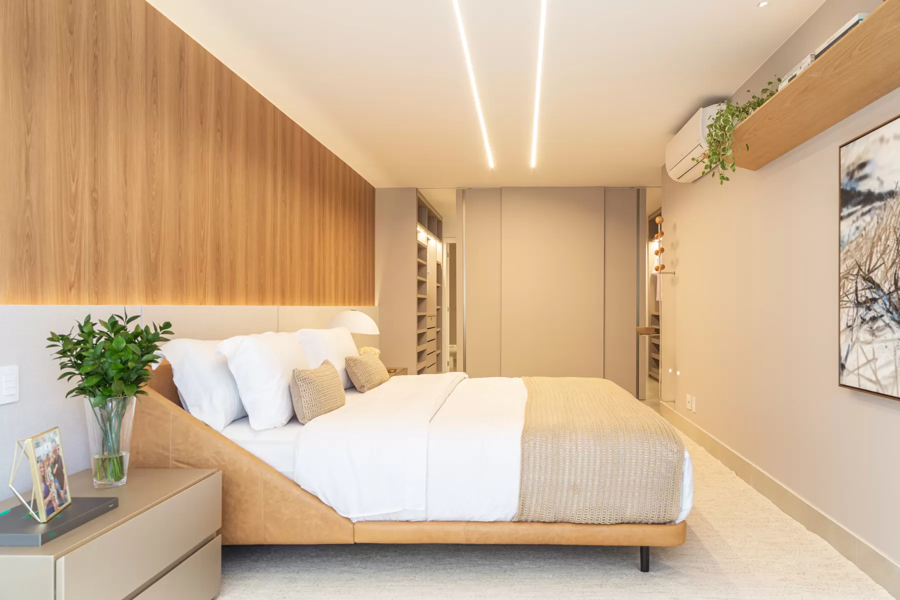 A cabeceira em madeira é o destaque desta suíte, enquanto ao fundo, o closet exibe o elegante acabamento Laminato Nude.