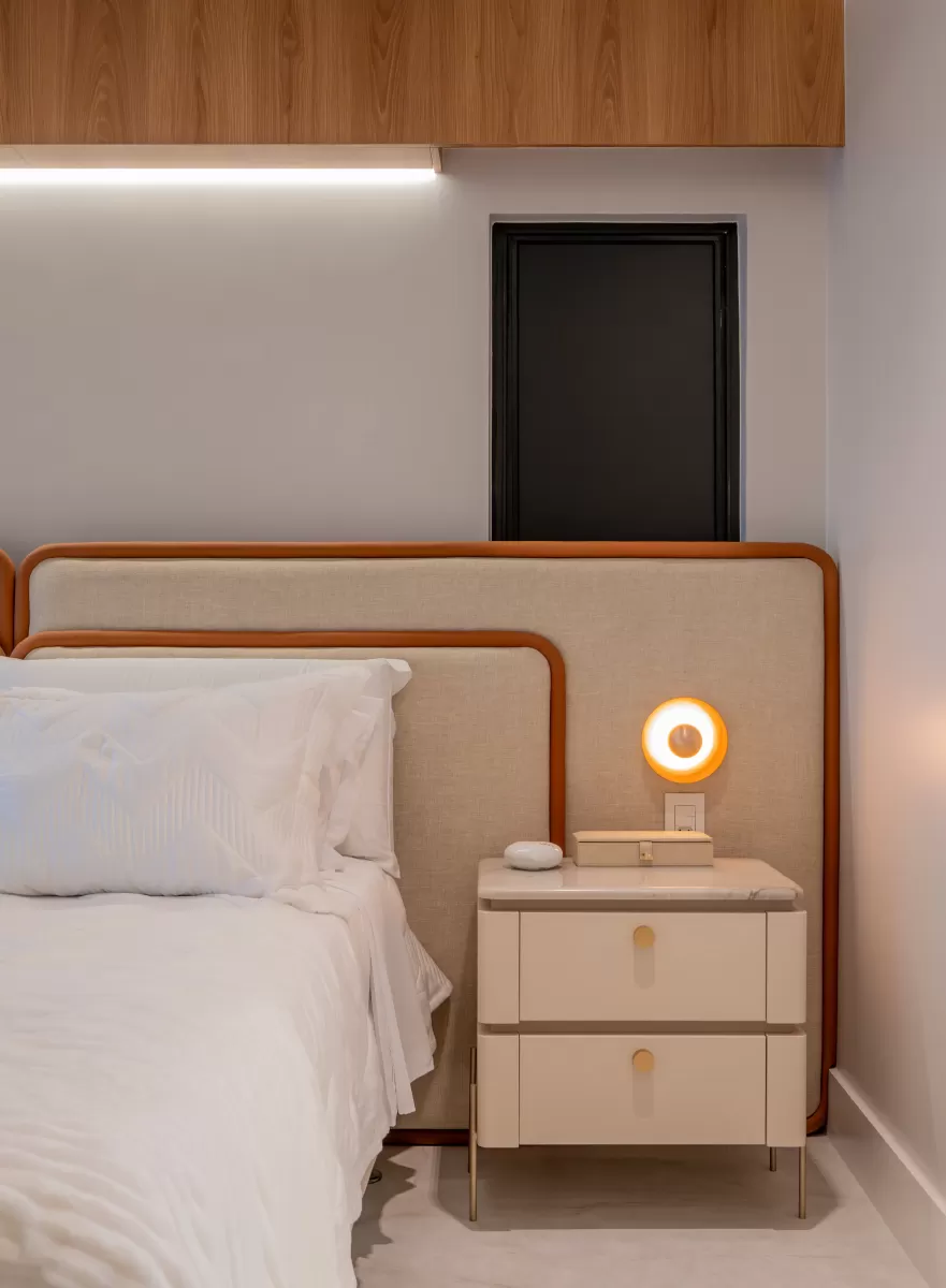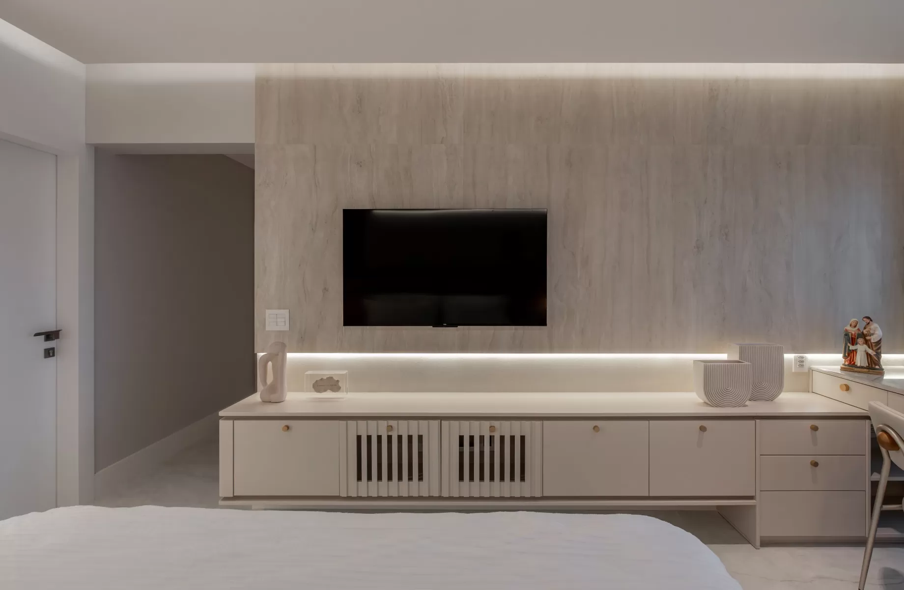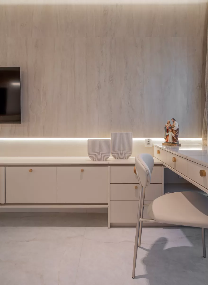 A suíte master foi concebida como um espaço de descanso e bem-estar, com marcenaria Bontempo que combina linhas limpas, tons acolhedores e acabamentos sofisticados. A Lacca Corda predomina no ambiente, criando uma atmosfera elegante e atemporal, complementada por nuances suaves como Alba, Nude e Argila. Os puxadores Radio, em acabamento dourado, adicionam um ponto de brilho sutil e refinado às frentes dos armários. As portas de passagem em sistema de giro, com dobradiças embutidas e acabamento em Laminato Supreme, contam com fechadura Boss e maçaneta em Níquel Vecchio com roseta quadrada fosca, evidenciando o cuidado nos detalhes e a experiência de uso. Tampos, prateleiras e gavetas acompanham a paleta do projeto, garantindo continuidade visual e funcionalidade. As gavetas modelo Felice Madeira oferecem abertura suave e precisão, resultando em um ambiente que alia conforto, elegância e praticidade