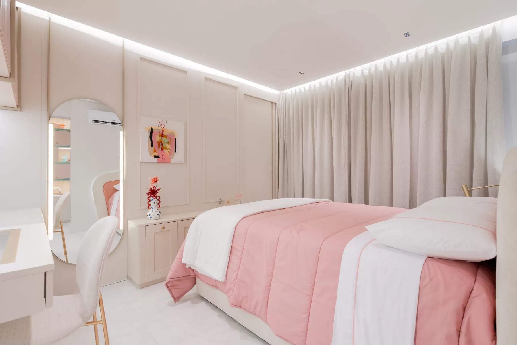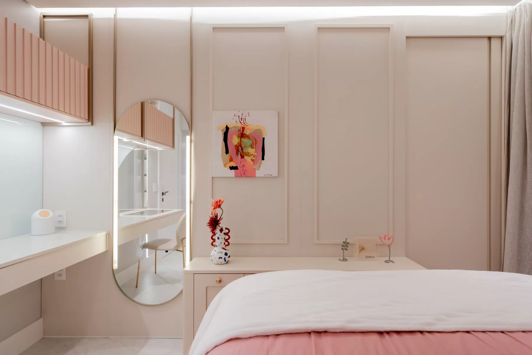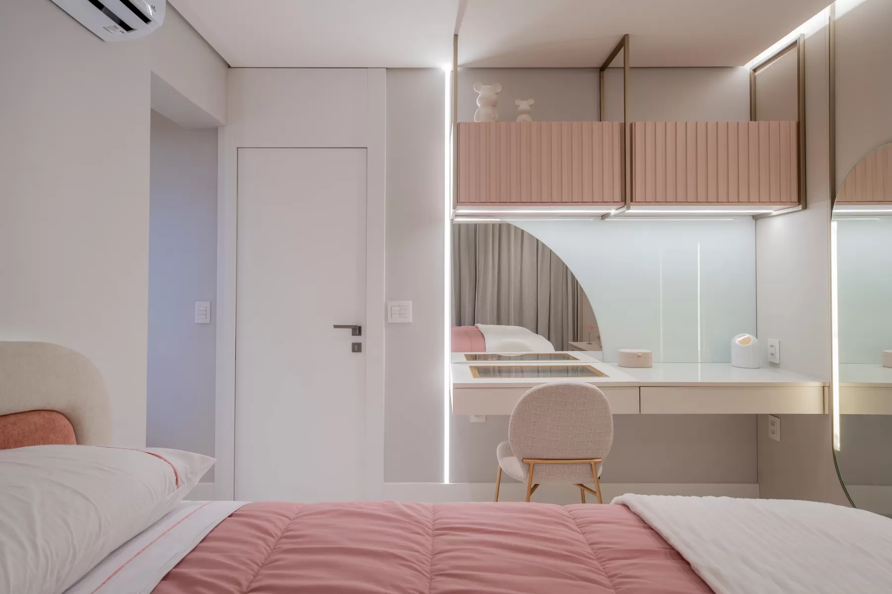 O quarto da filha foi projetado para transmitir delicadeza, leveza e sofisticação, com marcenaria Bontempo que equilibra estética e funcionalidade. A paleta suave combina os acabamentos Laccato Melissa, Lacca Ballerina, Lacca Corda e Laminato Pluma, criando um ambiente acolhedor e contemporâneo. Os puxadores Orion, em acabamento dourado, acrescentam elegância às frentes dos móveis, destacando o desenho com sutileza. As portas de passagem utilizam dois sistemas distintos: o sistema Flusso, com amortecimento e acabamento em Laminato Pluma, conecta a suíte ao closet de forma fluida e silenciosa; já as portas de giro da circulação para a suíte contam com dobradiças embutidas, fechadura Boss e maçaneta em Níquel Vecchio com roseta Quadrato fosca. Tampos e prateleiras seguem os acabamentos Laminato Nude e Grano, equilibrando textura e luminosidade. As gavetas modelo Felice Madeira garantem suavidade no uso diário, enquanto os acessórios internos asseguram organização e praticidade. O resultado é um espaço funcional, elegante e atemporal, pensado para acompanhar diferentes fases.