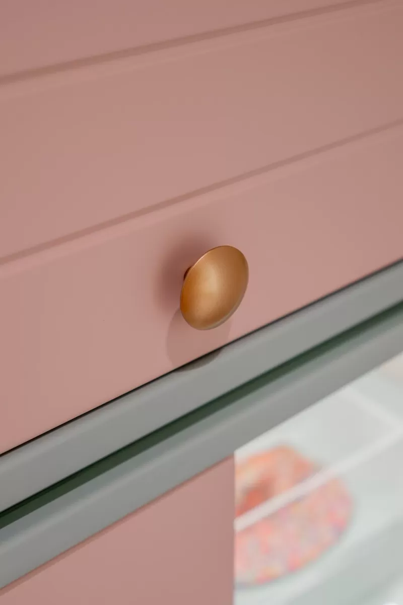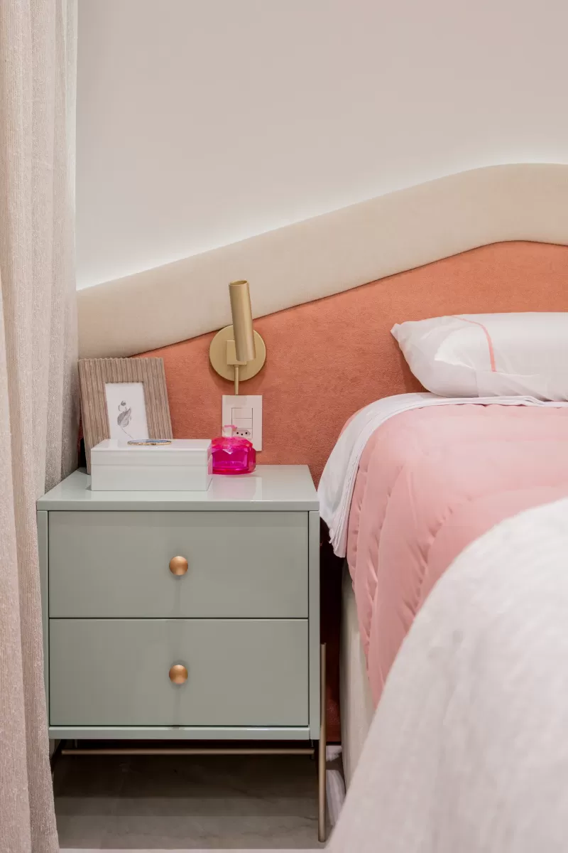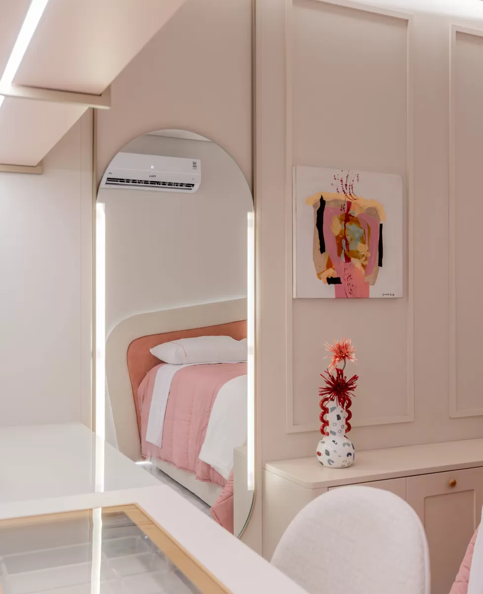 O quarto da filha foi projetado para transmitir delicadeza, leveza e sofisticação, com marcenaria Bontempo que equilibra estética e funcionalidade. A paleta suave combina os acabamentos Laccato Melissa, Lacca Ballerina, Lacca Corda e Laminato Pluma, criando um ambiente acolhedor e contemporâneo. Os puxadores Orion, em acabamento dourado, acrescentam elegância às frentes dos móveis, destacando o desenho com sutileza. As portas de passagem utilizam dois sistemas distintos: o sistema Flusso, com amortecimento e acabamento em Laminato Pluma, conecta a suíte ao closet de forma fluida e silenciosa; já as portas de giro da circulação para a suíte contam com dobradiças embutidas, fechadura Boss e maçaneta em Níquel Vecchio com roseta Quadrato fosca. Tampos e prateleiras seguem os acabamentos Laminato Nude e Grano, equilibrando textura e luminosidade. As gavetas modelo Felice Madeira garantem suavidade no uso diário, enquanto os acessórios internos asseguram organização e praticidade. O resultado é um espaço funcional, elegante e atemporal, pensado para acompanhar diferentes fases.