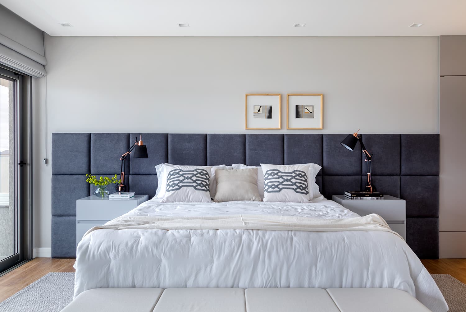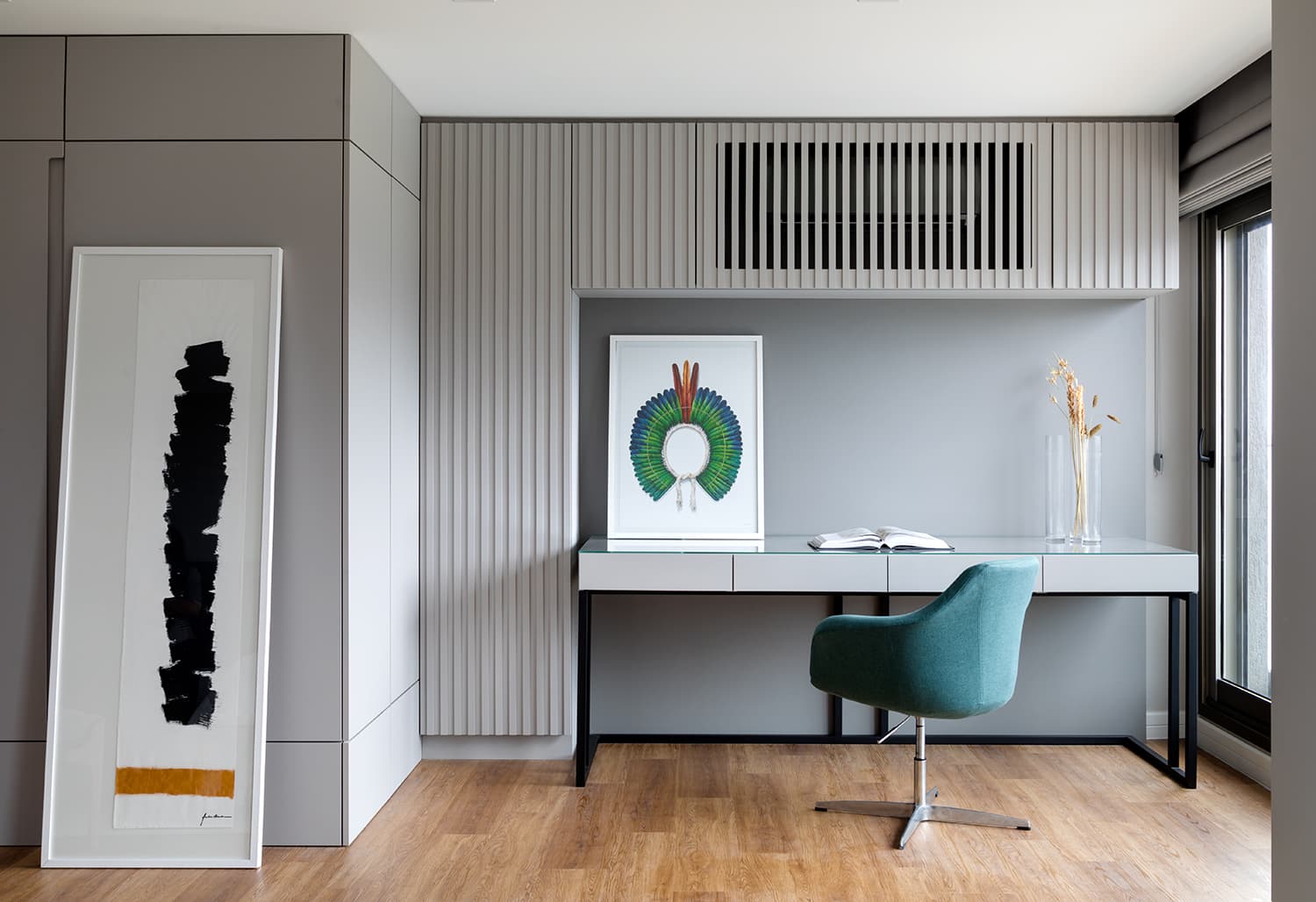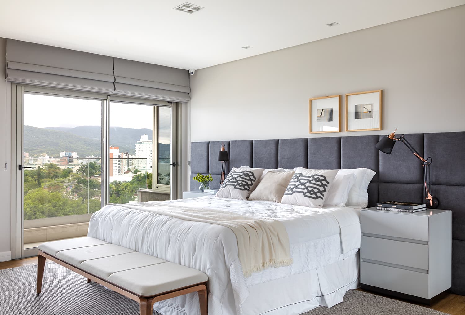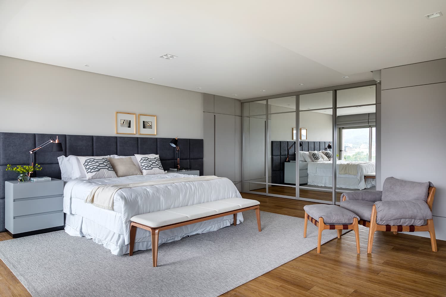 Na suíte do casal participou de cada detalhe. Nela reaproveitamos alguns móveis que eles já tinham, como a cama, as mesas de cabeceiras repaginadas e a cadeira office. Para a cabeceira, eles praticamente desenharam com lápis e papel o que queriam, e assim foi feito, uma cabeceira totalmente personalizada ao gosto dos clientes. Para amarrar isso tudo, desenvolvemos painéis que se estendem pela maior parte do quarto; ele camufla a porta dos banheiros e mescla-se com o móvel da parte de home office. Esses móveis receberam a mesma estética do living, com portas ripadas, pela mesma estratégia de camuflar um dos ares condicionados.