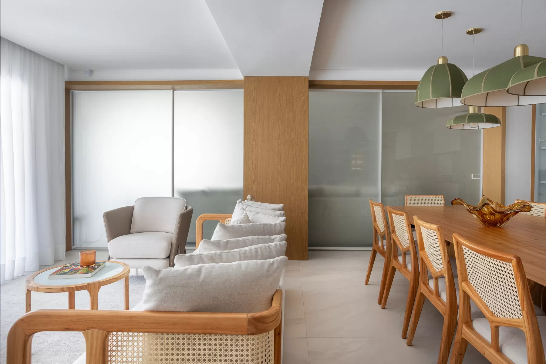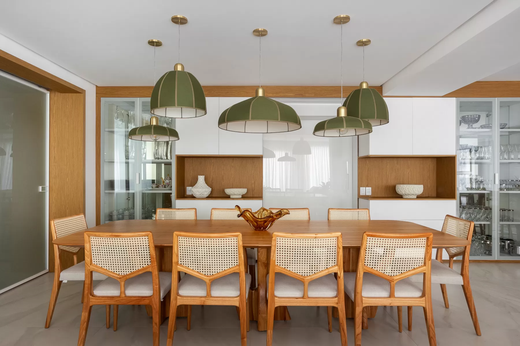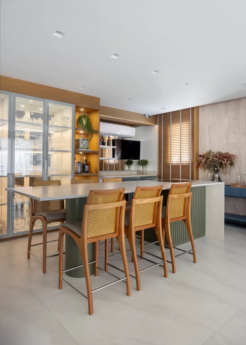 Pensando em um ambiente integrado e para receber pessoas, a arquiteta Ana Paula projetou este grande living, com duas grandes cristaleiras, um mini bar e uma bancada de apoio.