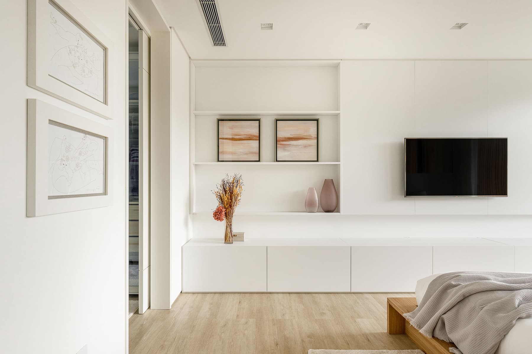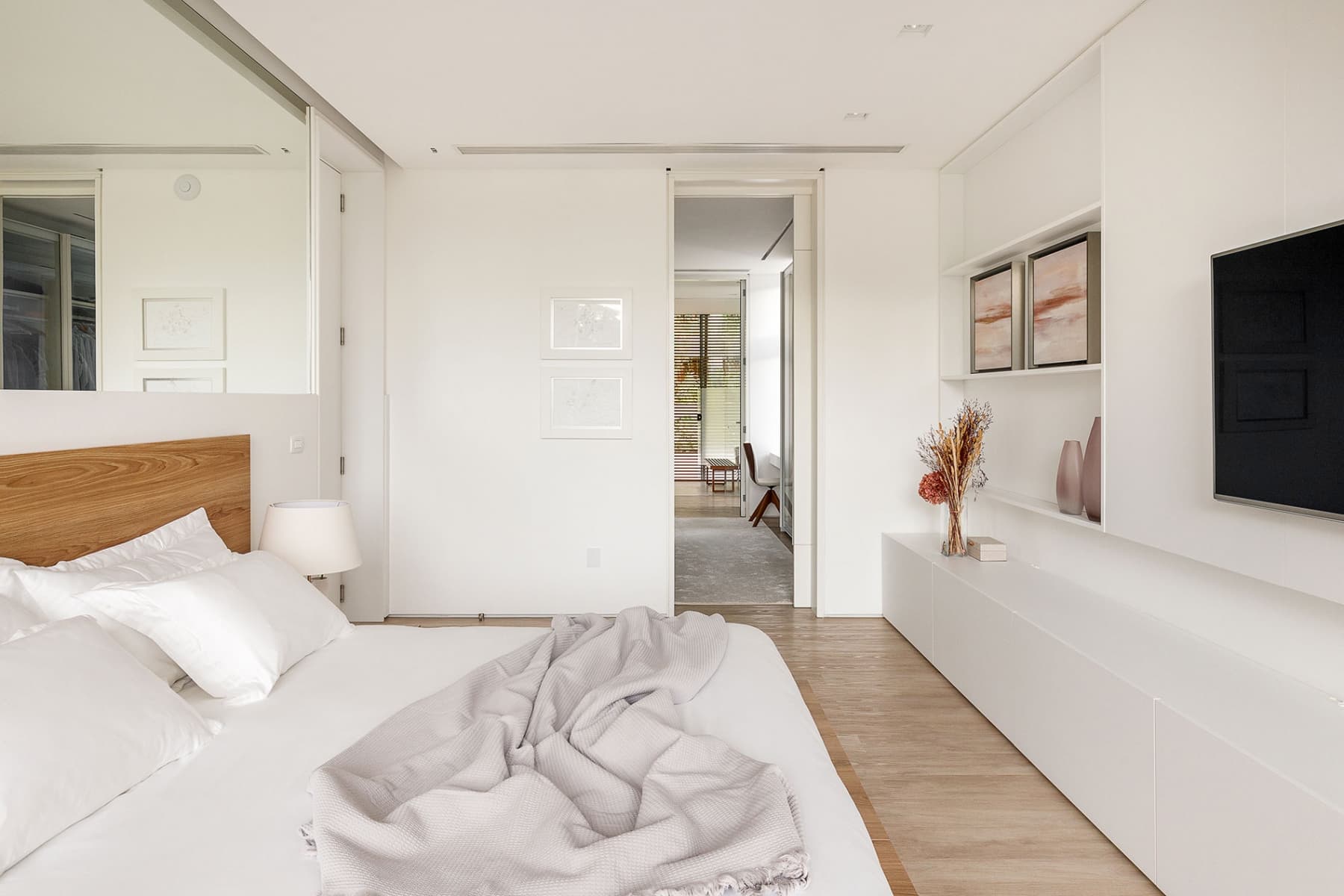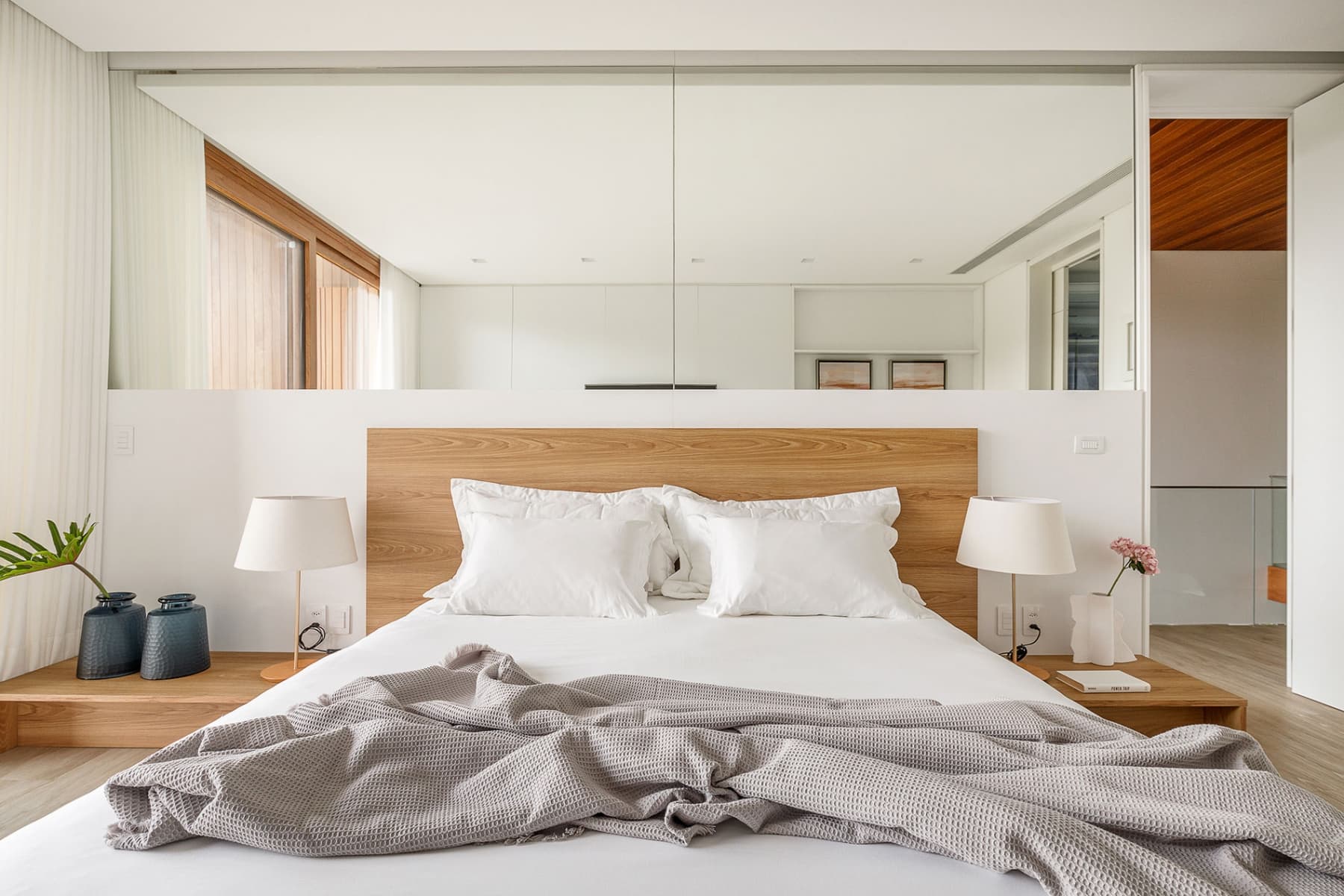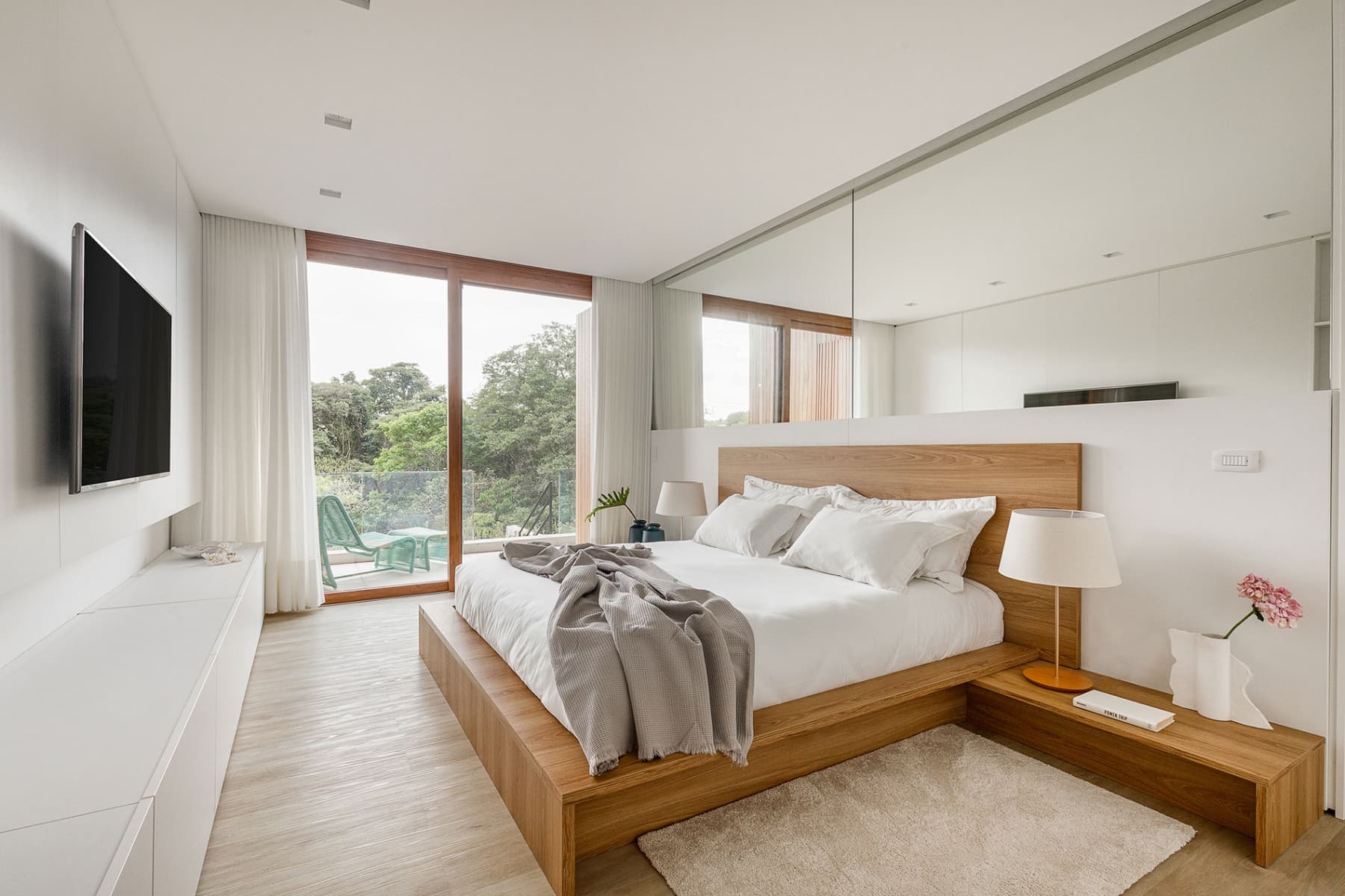 A suíte do casal tem conexão com a frente e com os fundos da casa, com sacada integrada ao terraço-verde criado sobre a cobertura da garagem. Com um jardim de ervas aromáticas, este espaço foi planejado para proporcionar um refúgio para o relaxamento.