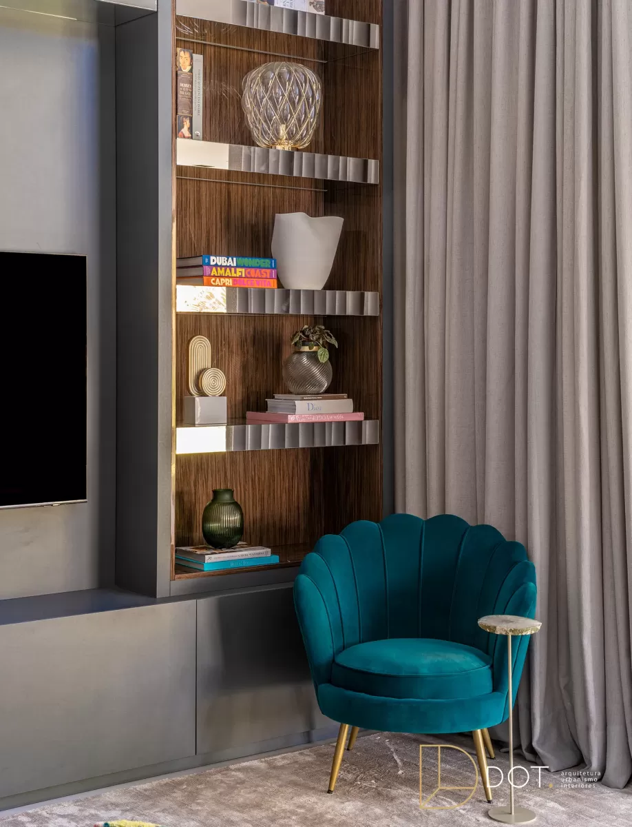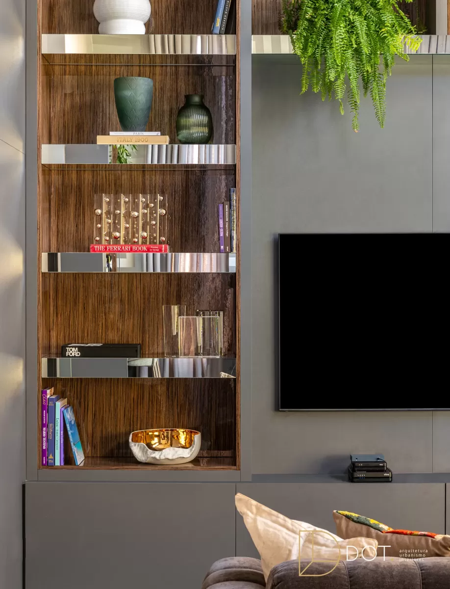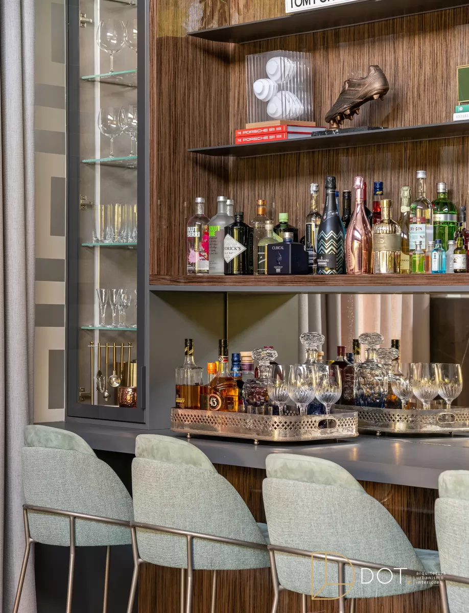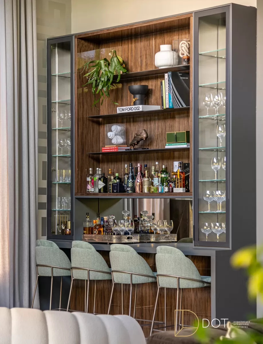 Este ambiente integrado combina um home theater e um bar, oferecendo um estilo contemporâneo que une personalidade e conforto. As cores e o projeto cuidadosamente planejados criam um espaço ideal para momentos de lazer e socialização. Com móveis de linhas retas e acabamentos sofisticados, o espaço apresenta um mix harmonioso de madeira escura, detalhes em vidro, e texturas suaves, proporcionando um toque de elegância moderna. A área do bar é prática e convidativa, enquanto o home theater oferece um local confortável para assistir a filmes ou relaxar. Elementos decorativos, como livros, vasos, e obras de arte, adicionam um charme extra e tornam o ambiente ainda mais acolhedor e estiloso.