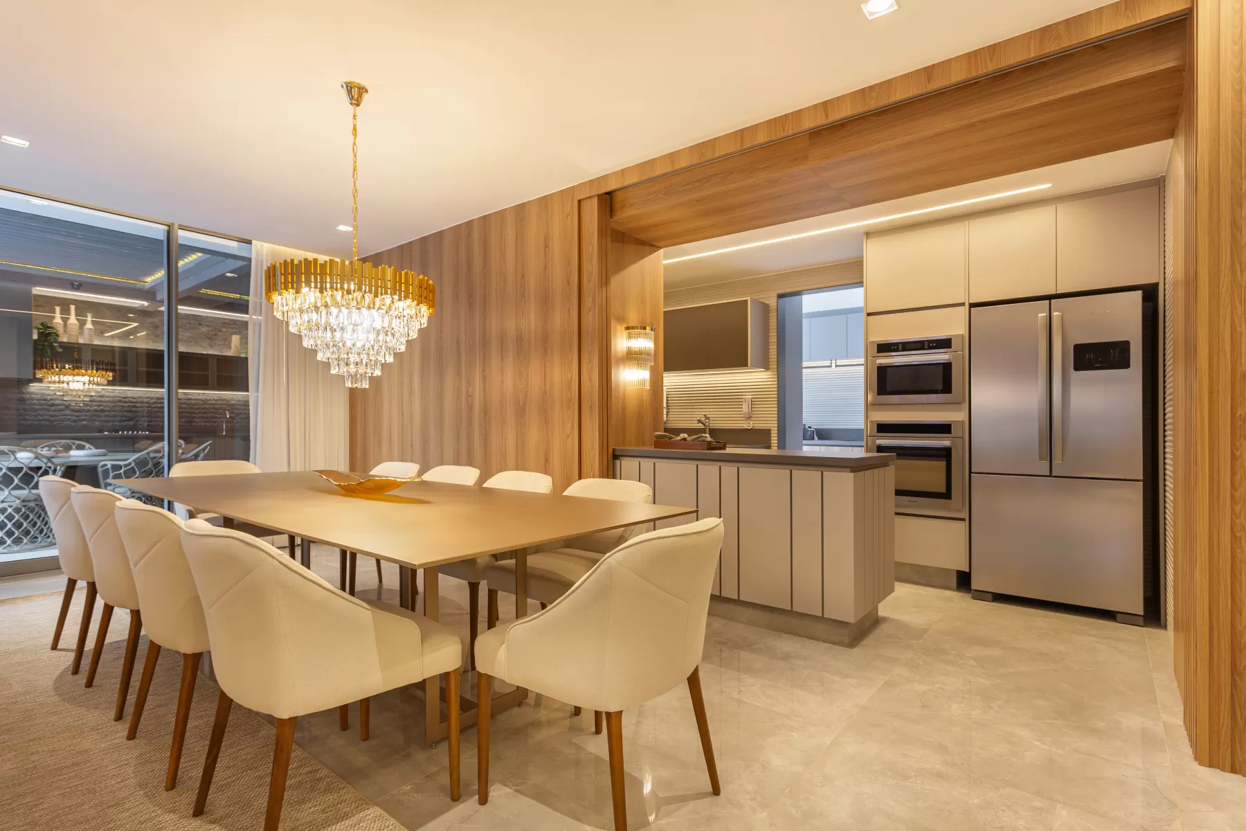 Ambiente contemporâneo e minimalista, com integração entre sala e cozinha. O sistema Soma proporciona flexibilidade ao layout, permitindo a separação dos espaços e valorizando a sala de jantar como ambiente independente.