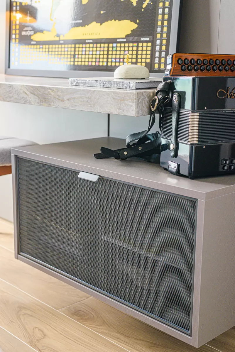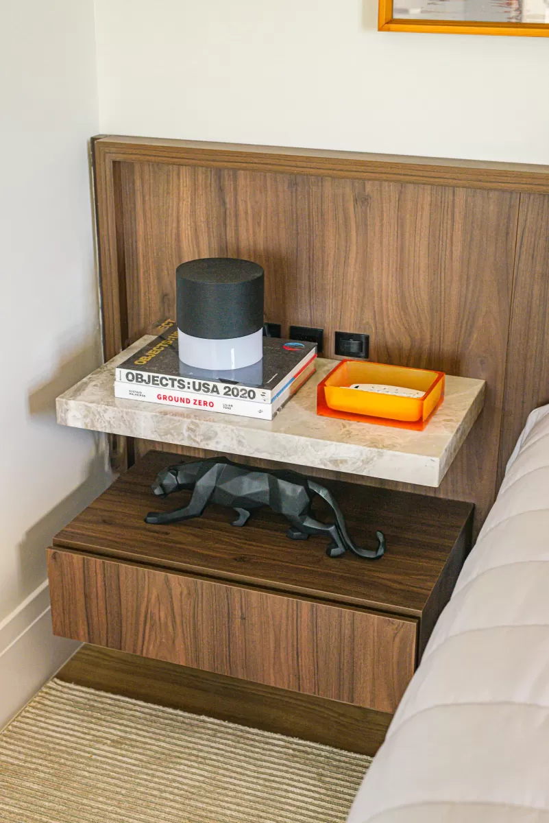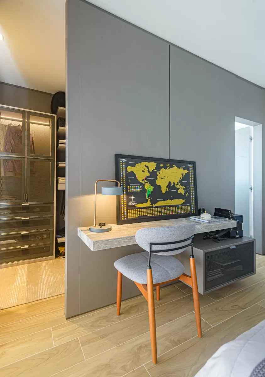 O quarto foi concebido com uma estética industrial, marcada por linhas retas, tons sóbrios e materiais que valorizam a autenticidade do espaço. Integrado ao ambiente, o closet traz praticidade e organização, mantendo a fluidez do layout. O resultado é um espaço contemporâneo, funcional e com personalidade, pensado para o dia a dia com conforto e estilo.