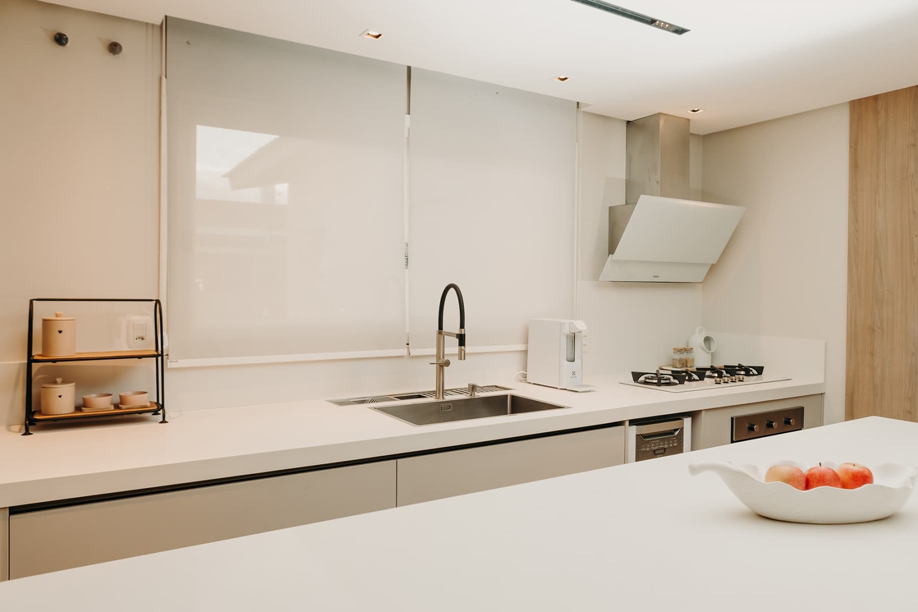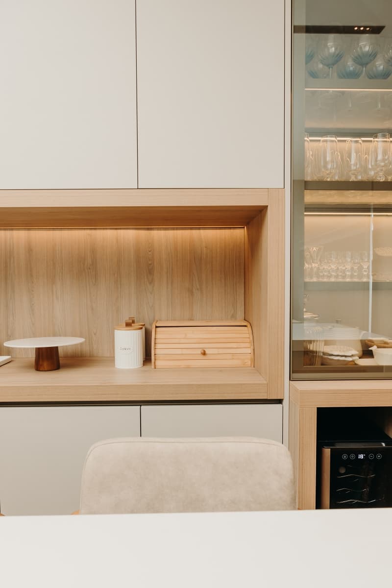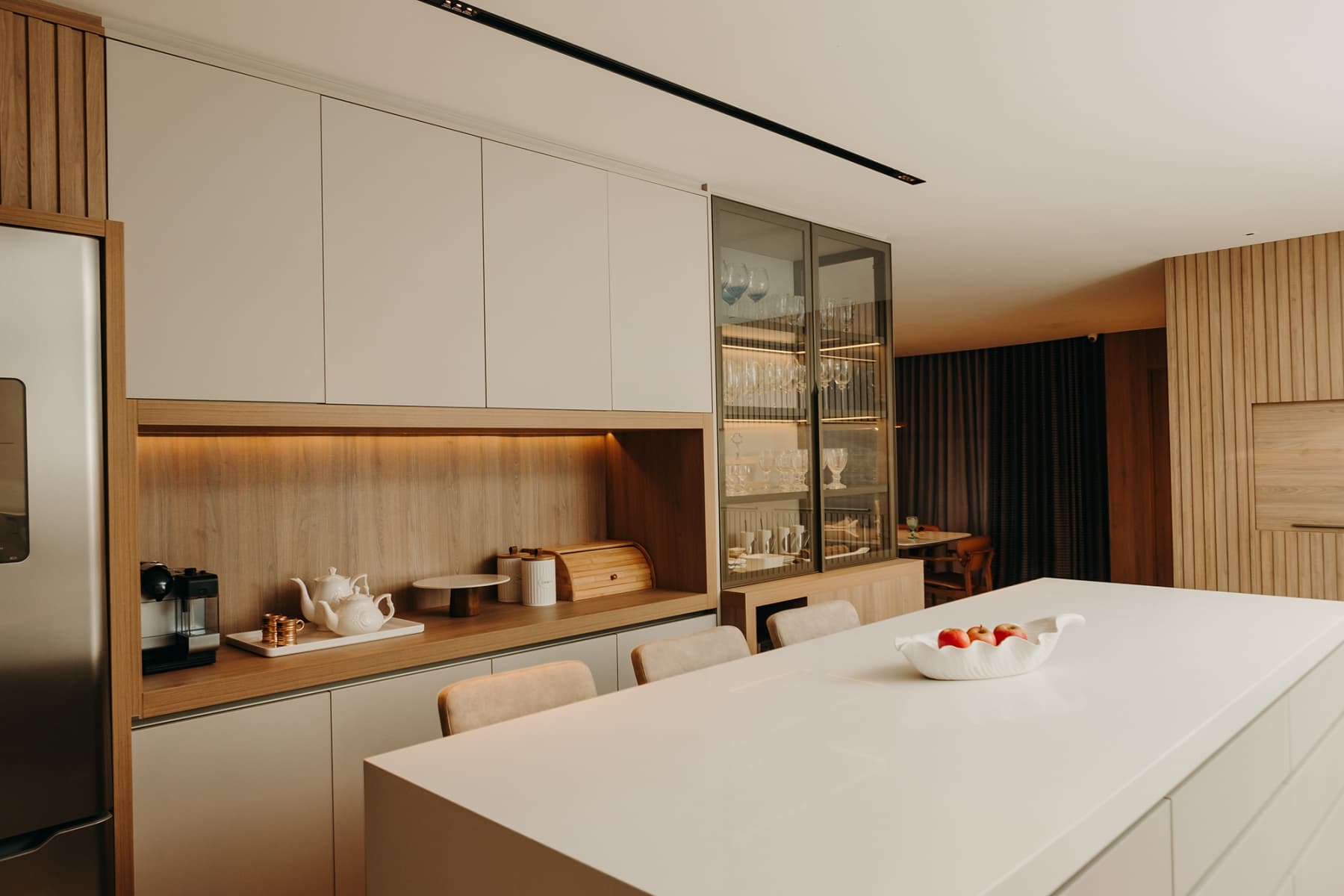 A paleta escolhida foi a de tons neutros.  Optou-se então pelo Laminato Nude para interagir com o amadeirado na parte da marcenaria, seguindo com o Quartzo Branco que reveste a Ilha e a bancada da pia.