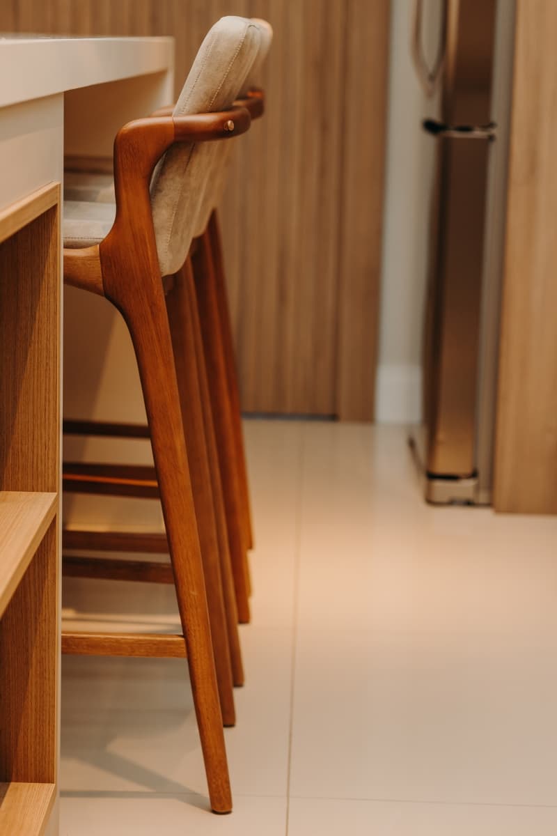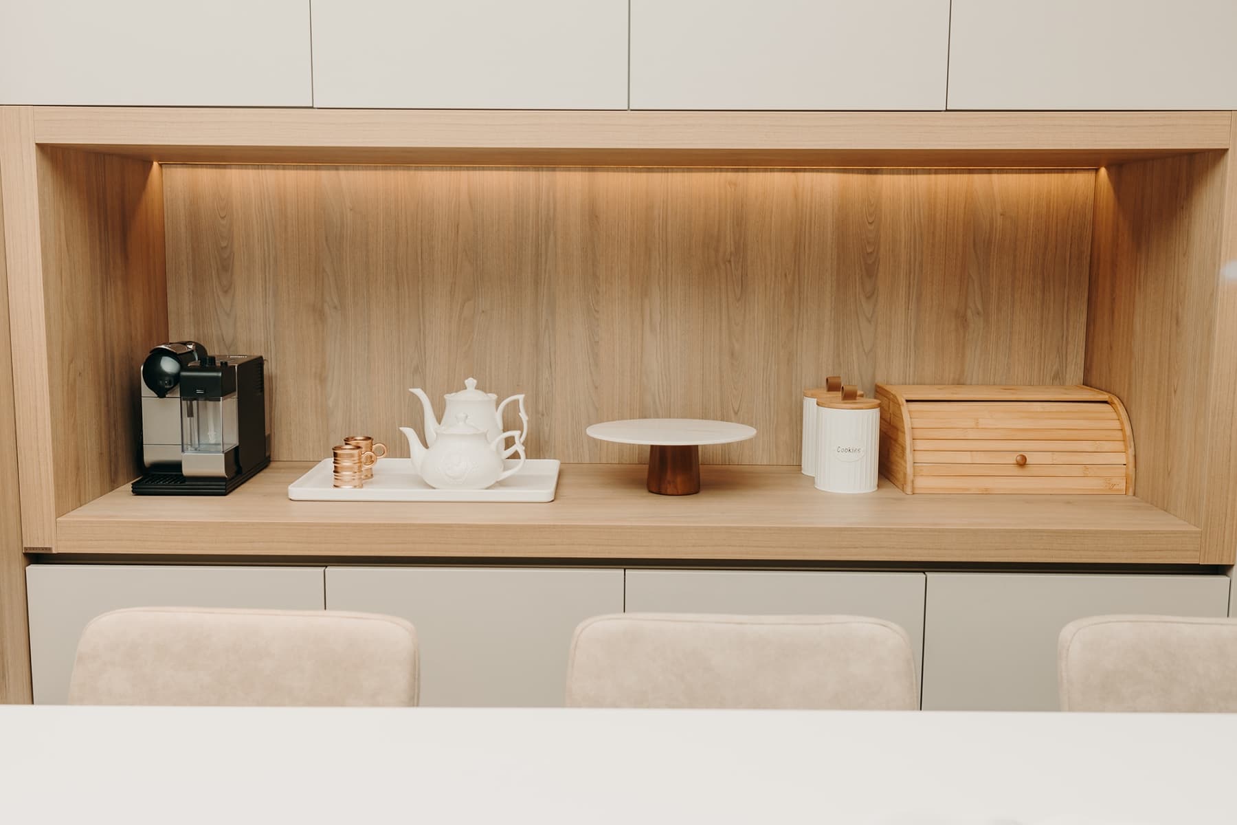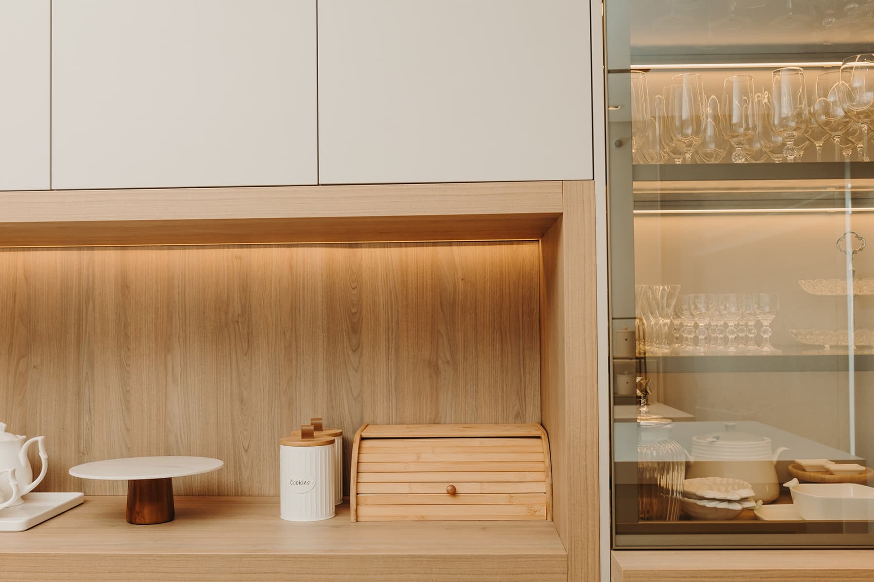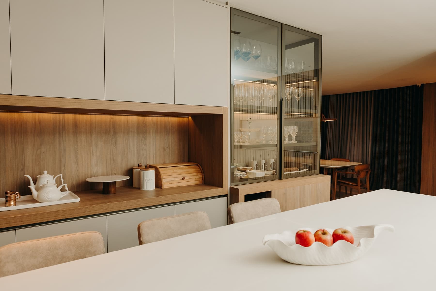 A paleta escolhida foi a de tons neutros.  Optou-se então pelo Laminato Nude para interagir com o amadeirado na parte da marcenaria, seguindo com o Quartzo Branco que reveste a Ilha e a bancada da pia.