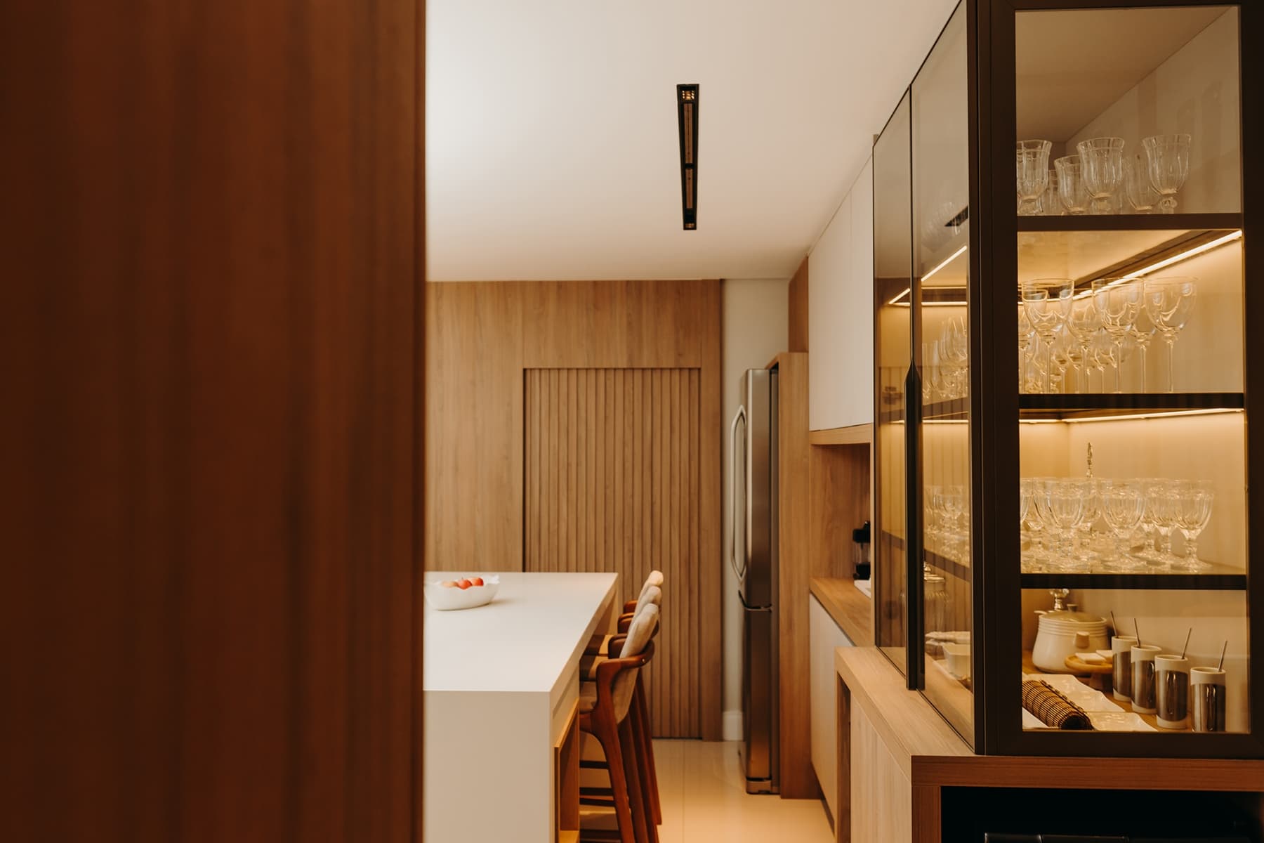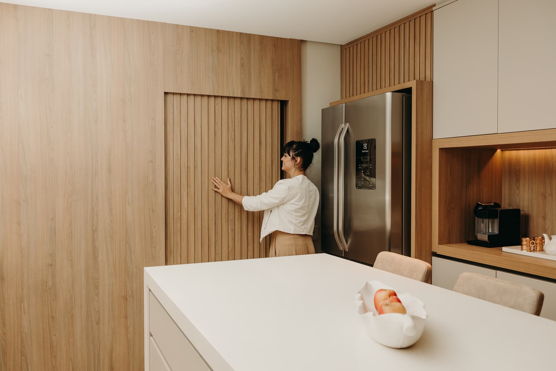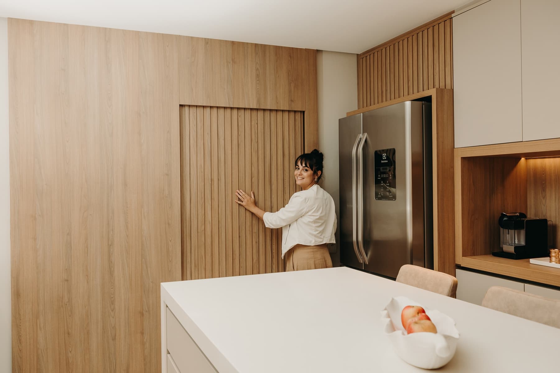 Neste espaço, a cozinha interage com o volume onde fica a churrasqueira e o lavabo. Este volume foi revestido com Painel Ripado  em Laminato Noce Autunno na parte da churrasqueira e o mesmo acabamento porém liso na lateral que segue até o lavabo.