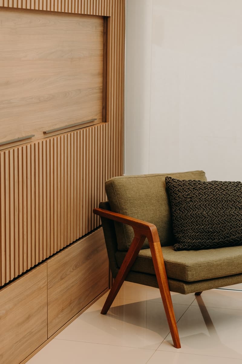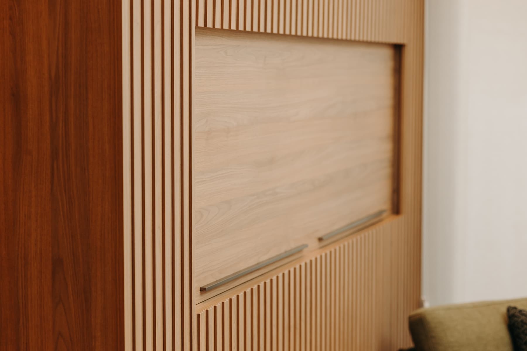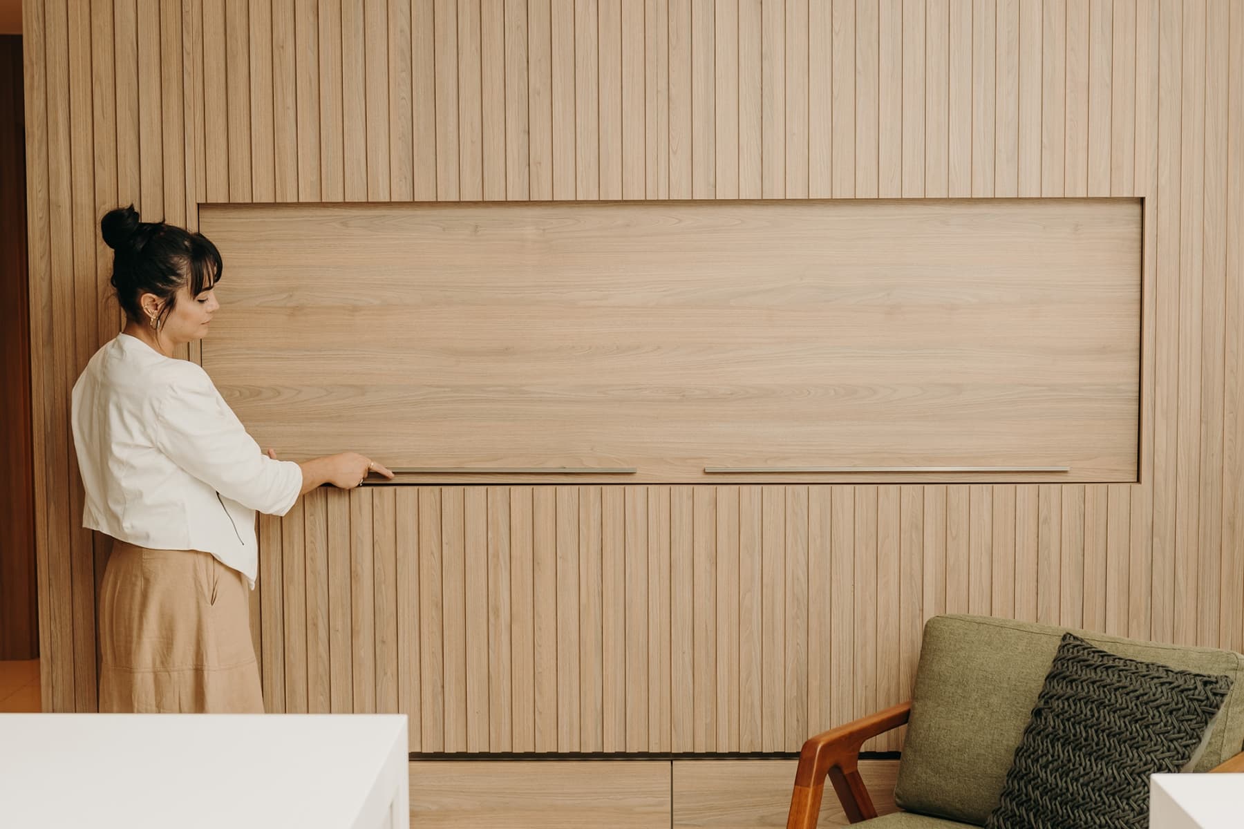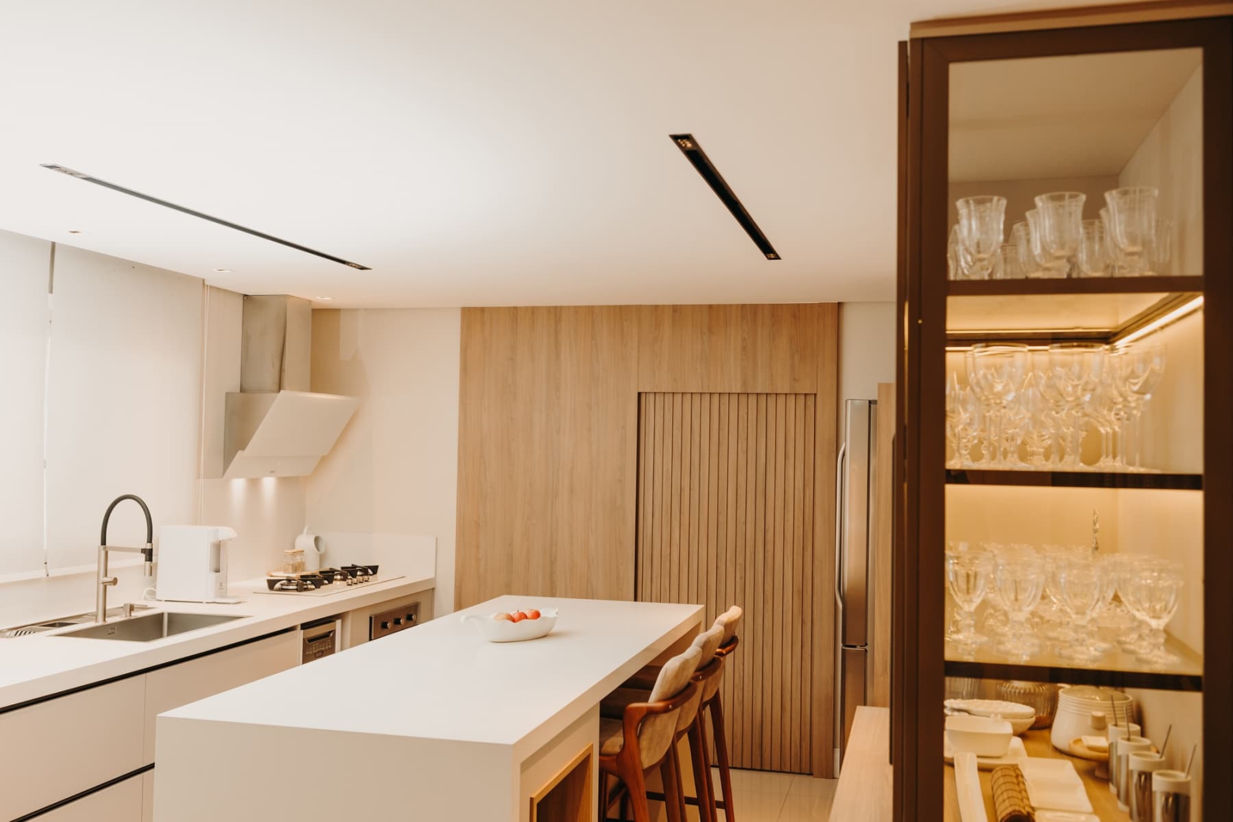 Neste espaço, a cozinha interage com o volume onde fica a churrasqueira e o lavabo. Este volume foi revestido com Painel Ripado  em Laminato Noce Autunno na parte da churrasqueira e o mesmo acabamento porém liso na lateral que segue até o lavabo.