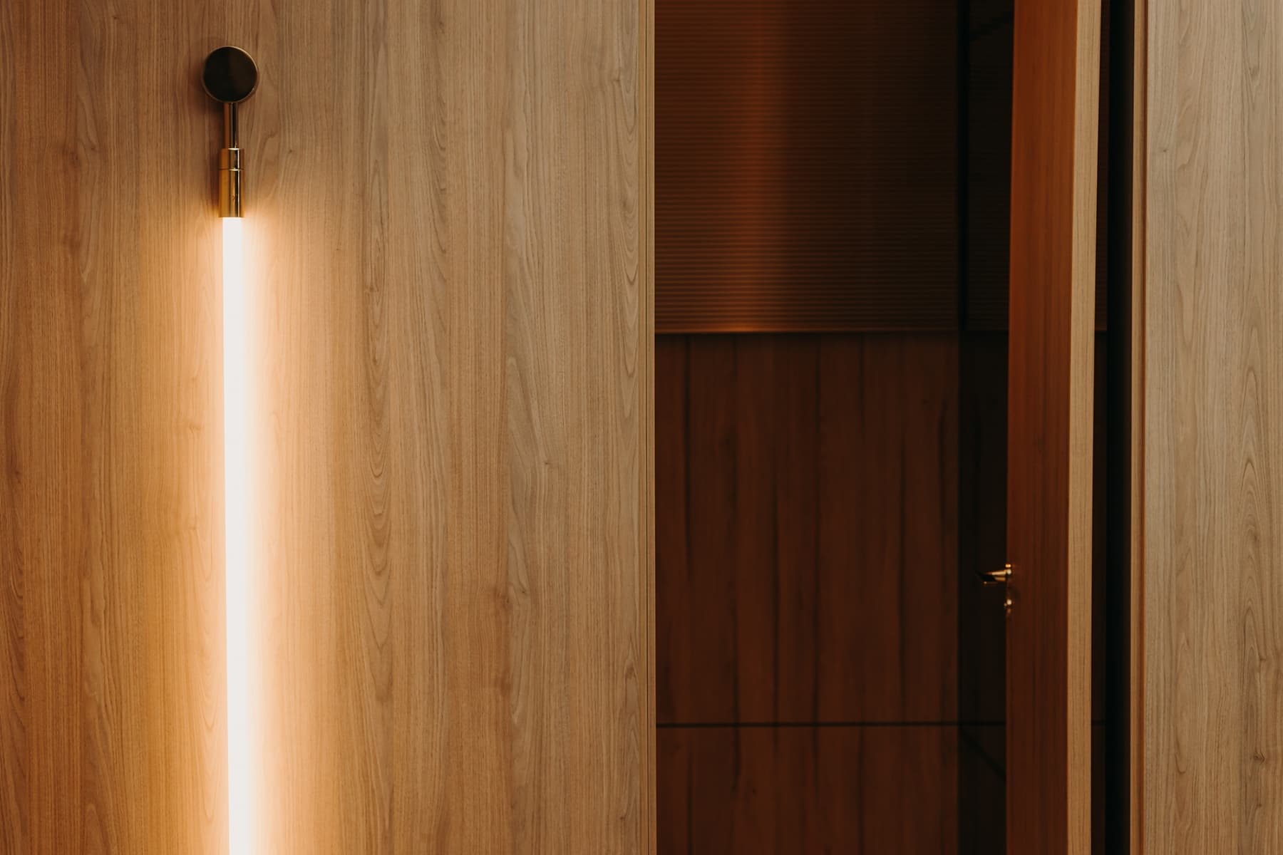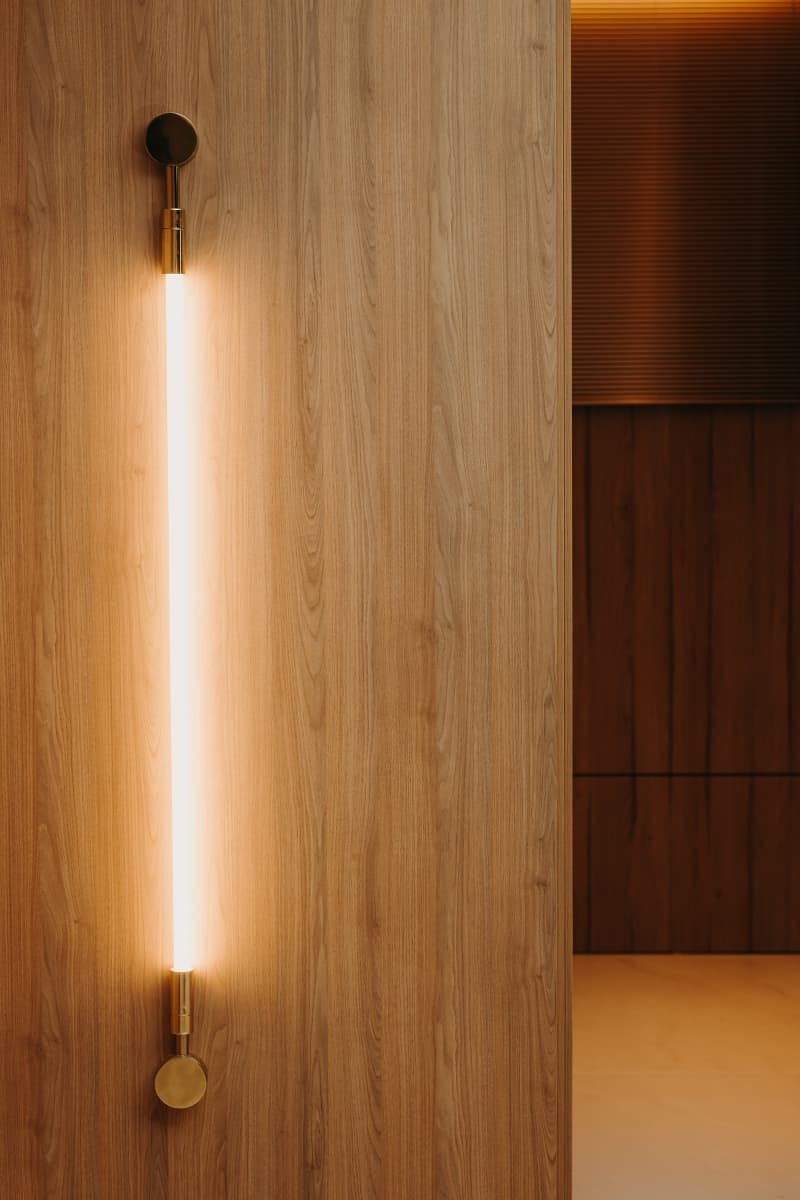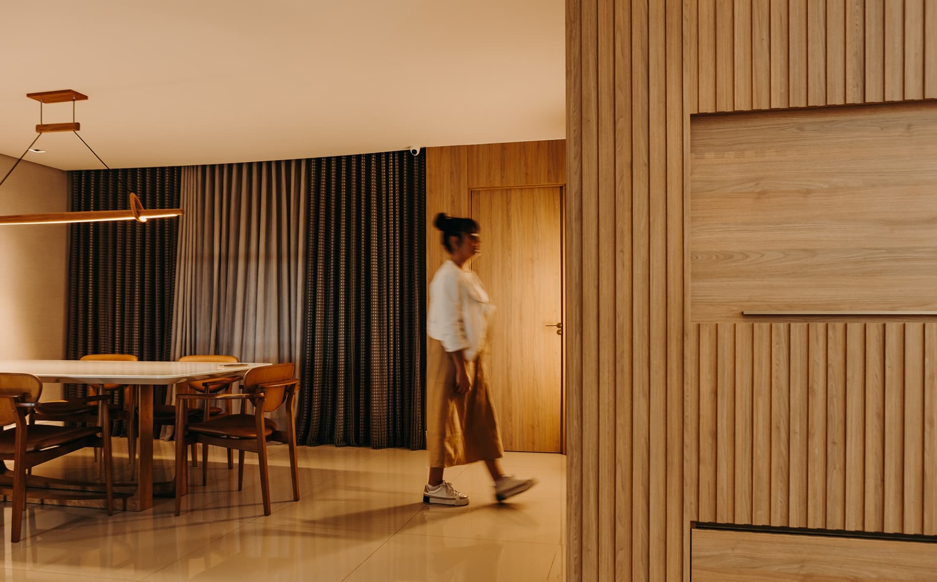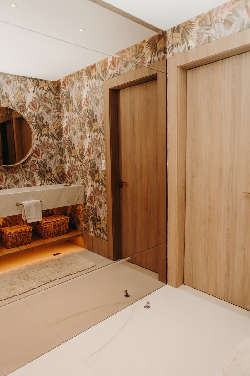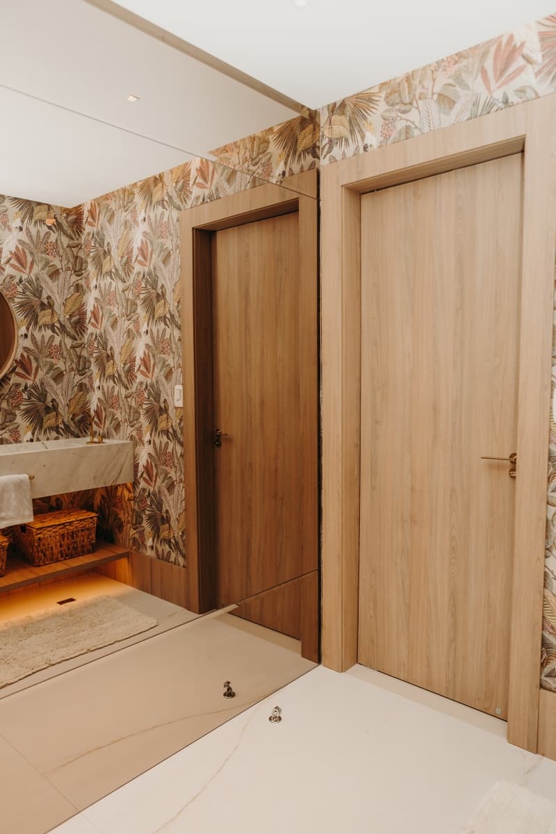 Tanto a porta do lavabo quanto a de acesso à área de Serviço foram mimetizadas ao painel, criando uma continuidade visual para o volume.