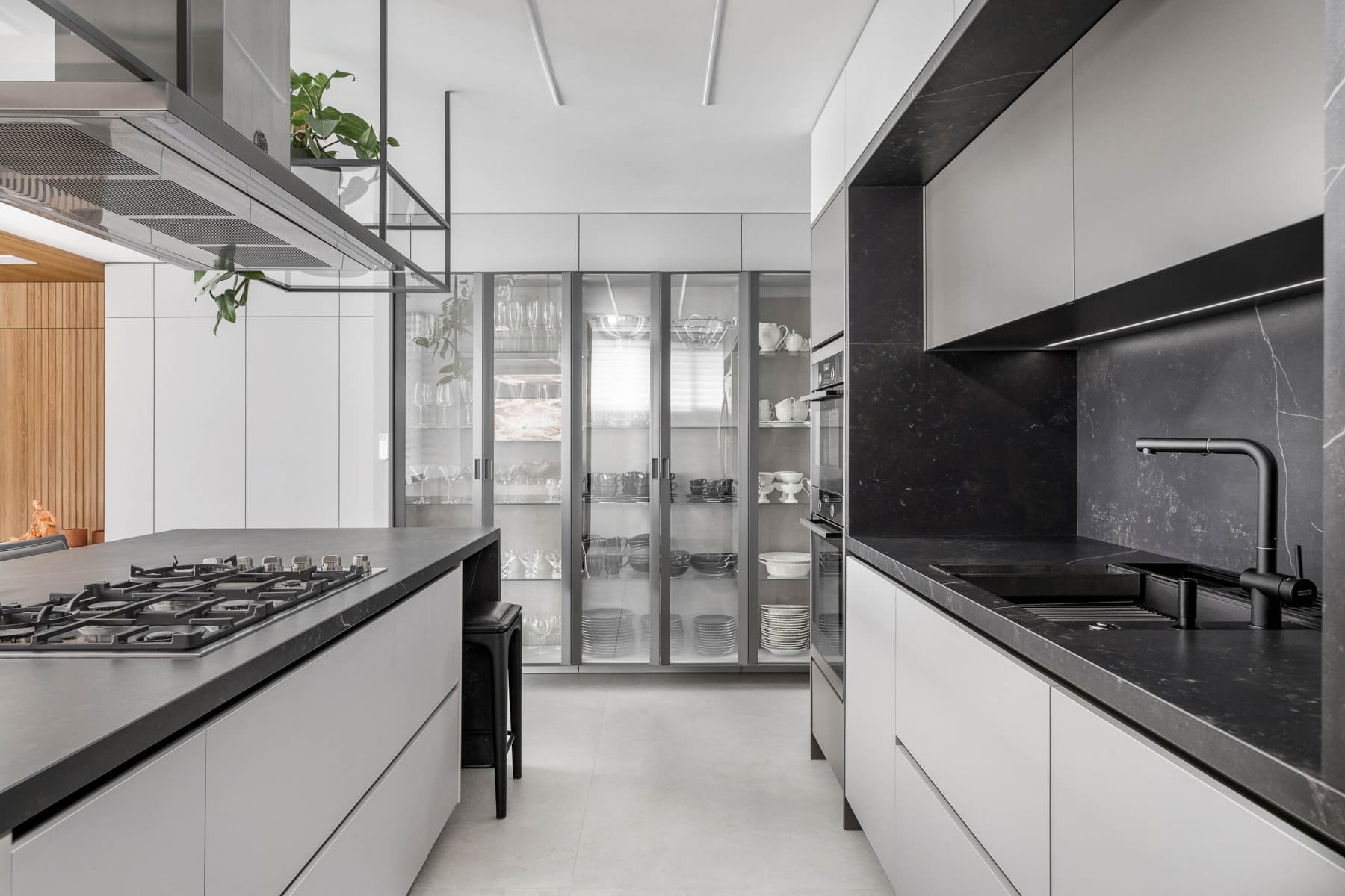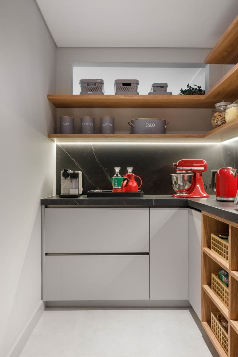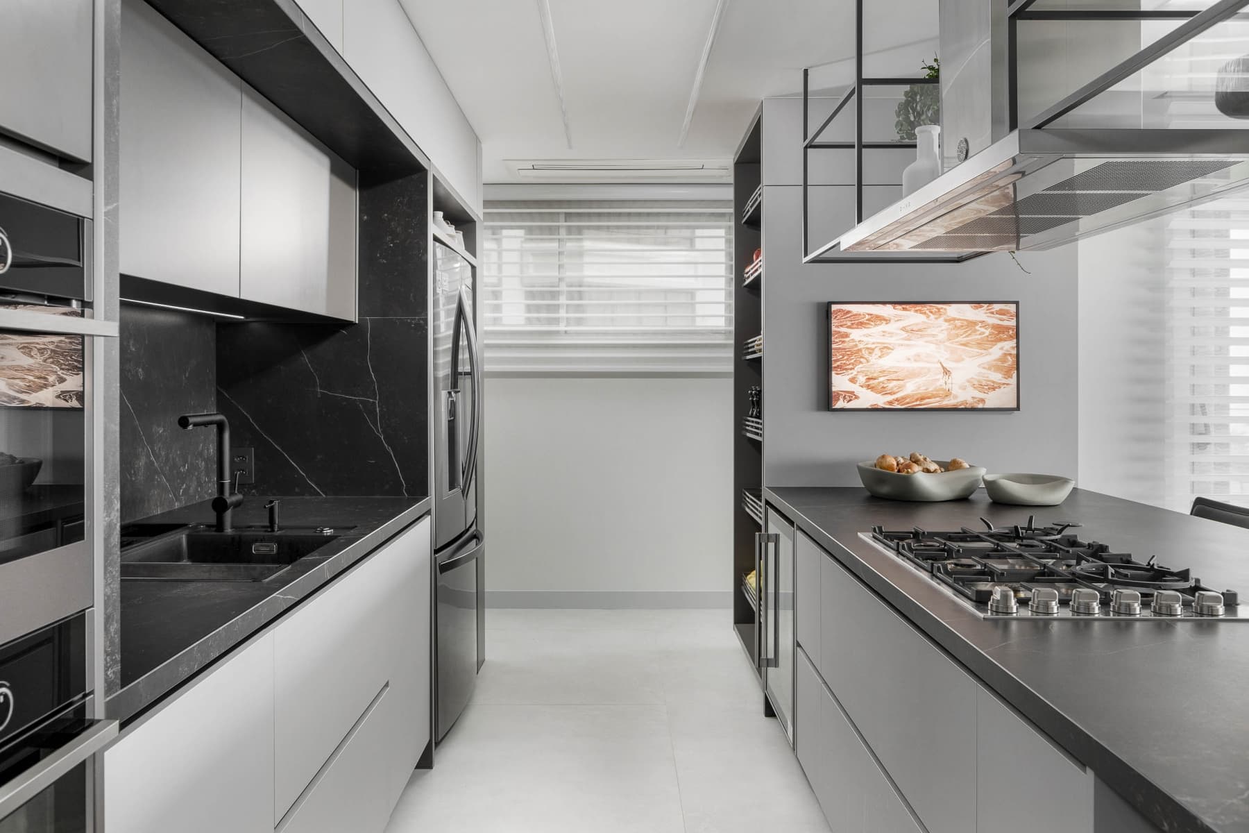 A cliente ama cozinhar e passar momentos em família na cozinha! Para ajudar a criar essas memórias, projetamos o espaço integrado com a área social, com vista privilegiada e cheio de soluções para deixar o local sempre ordenado e funcional. Área de serviço com muitos armários, bancadas e dois tanques.