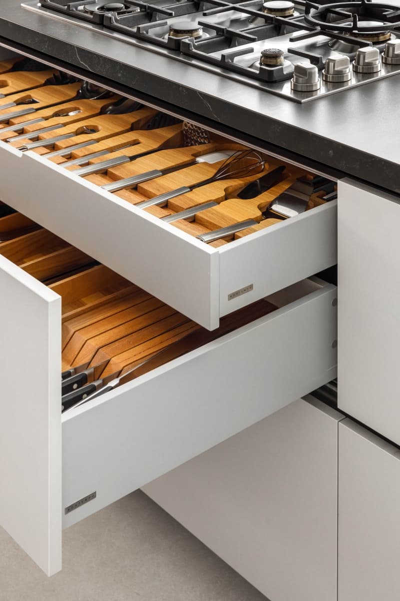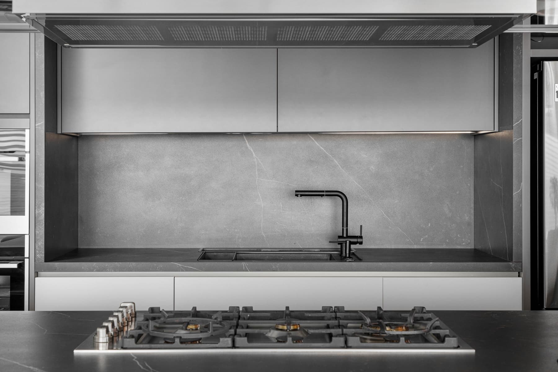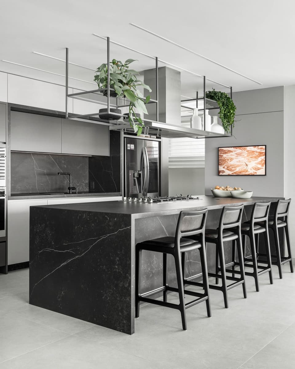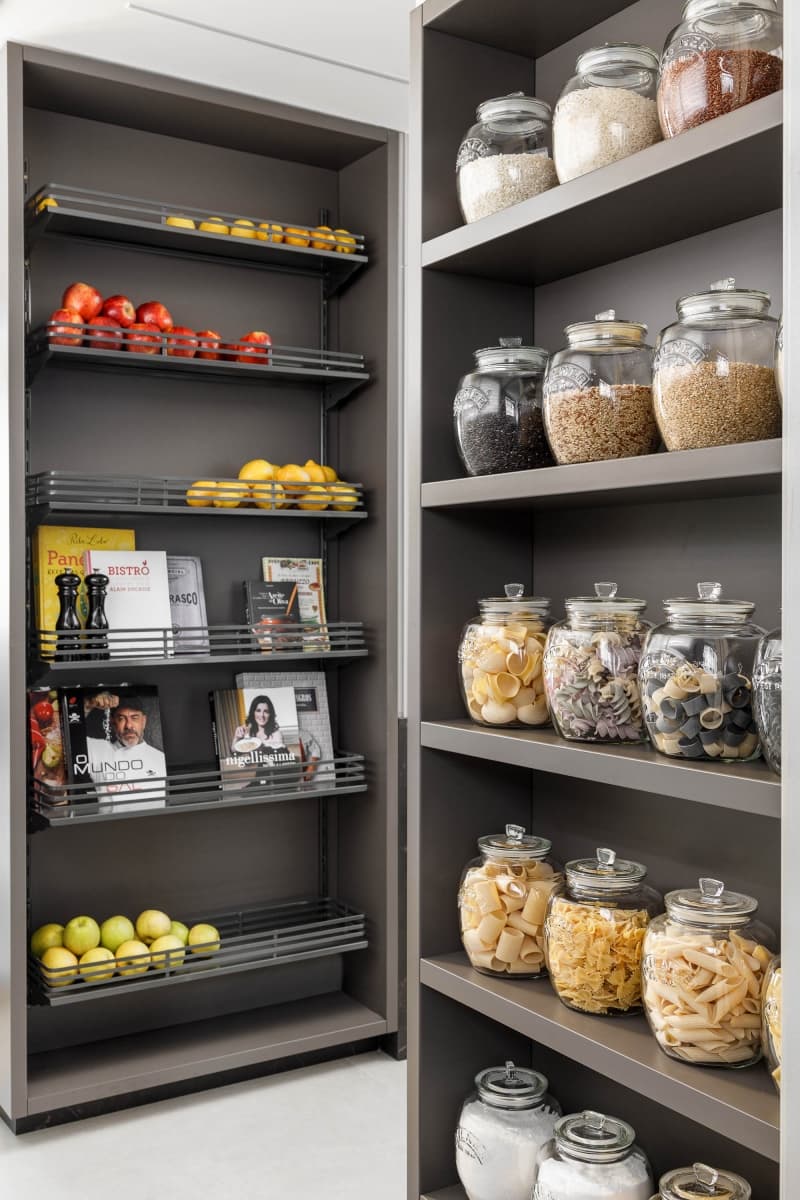 A cliente ama cozinhar e passar momentos em família na cozinha! Para ajudar a criar essas memórias, projetamos o espaço integrado com a área social, com vista privilegiada e cheio de soluções para deixar o local sempre ordenado e funcional. Área de serviço com muitos armários, bancadas e dois tanques.