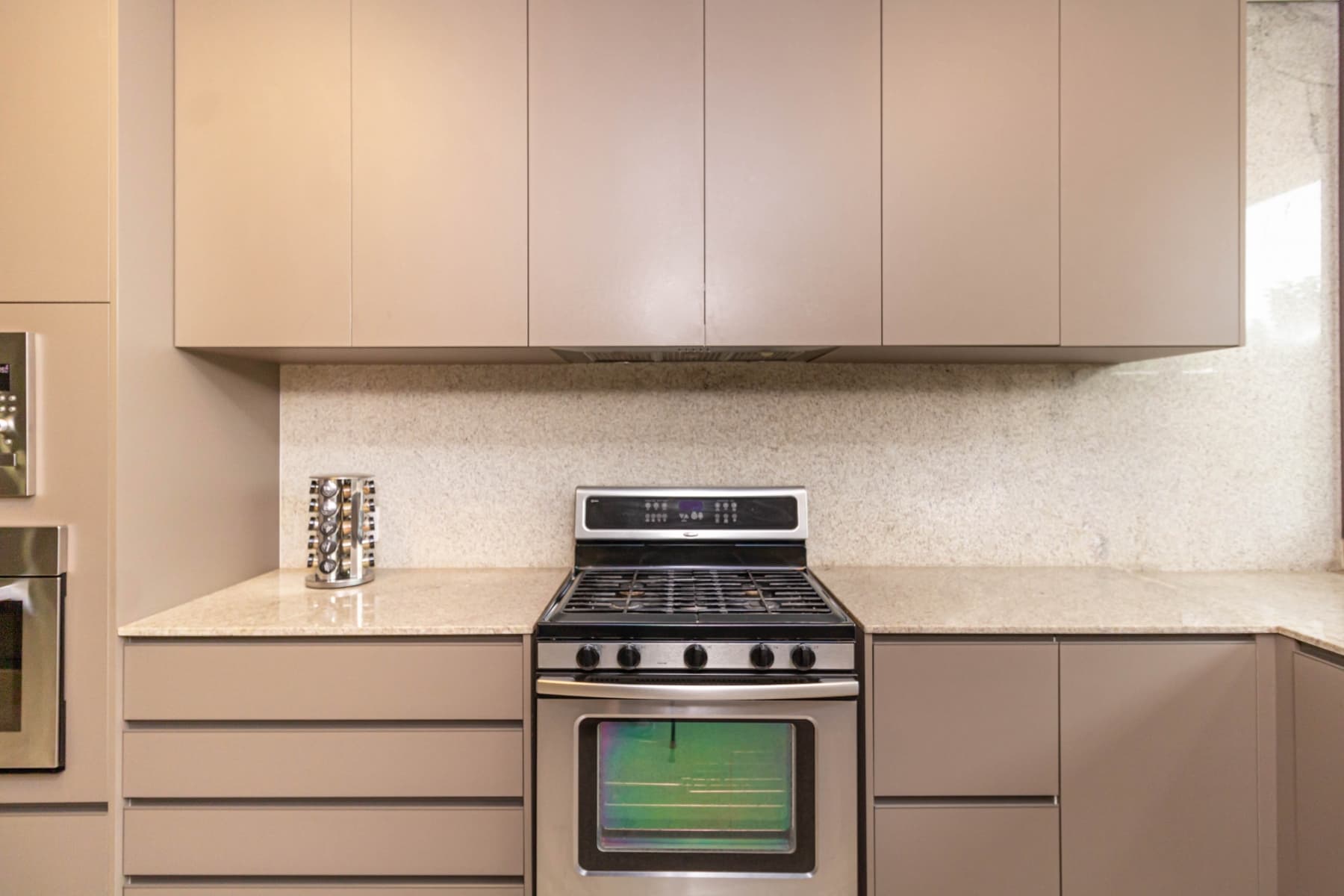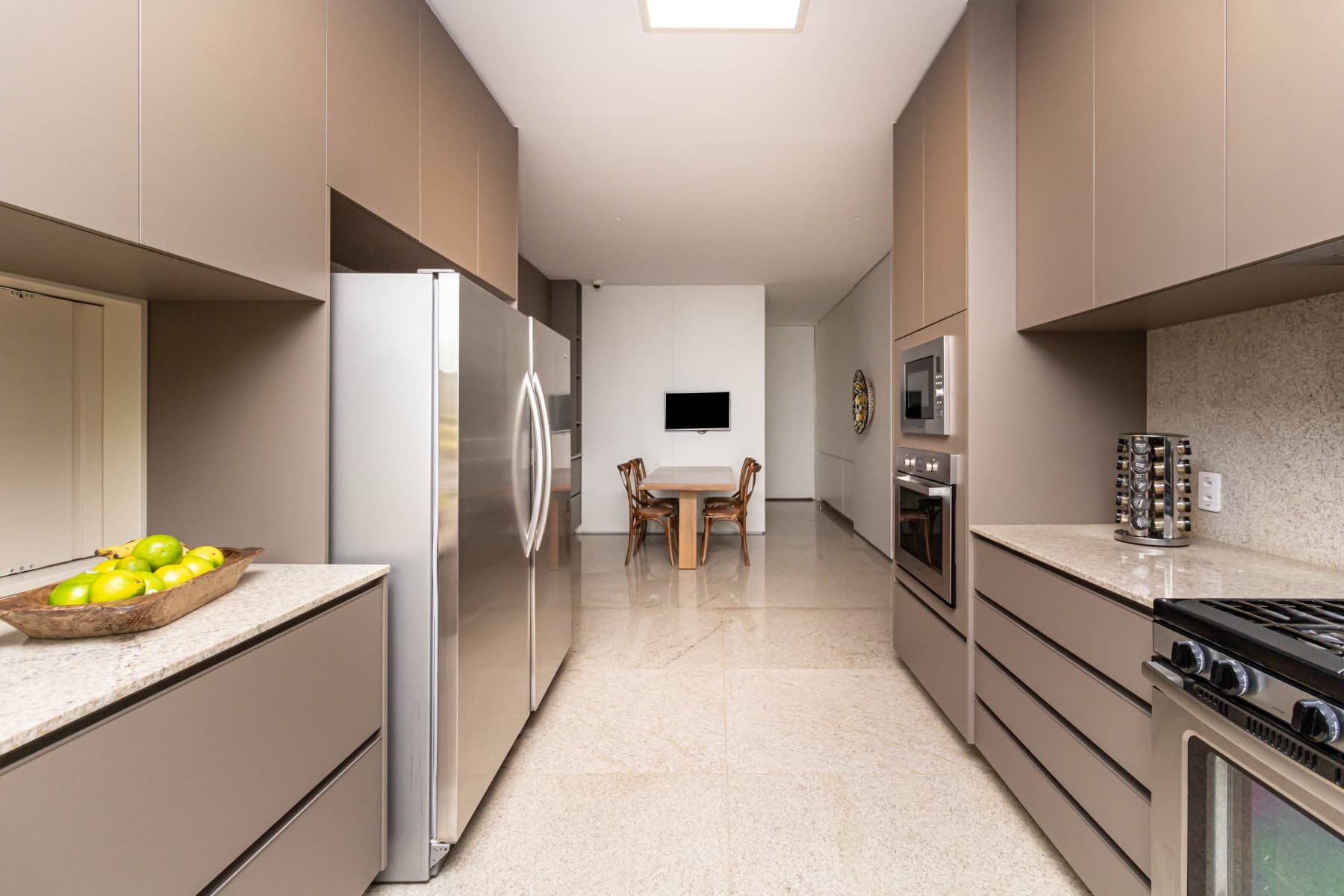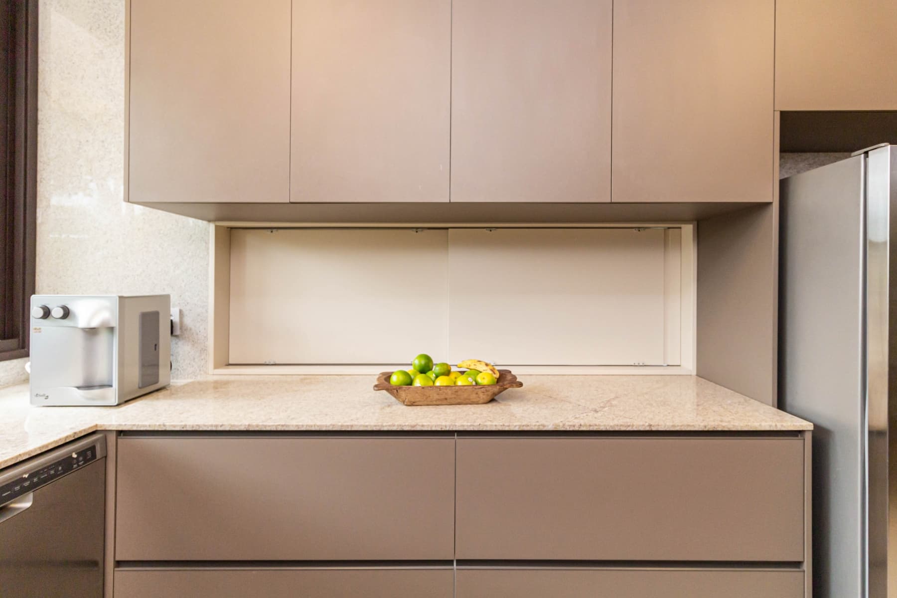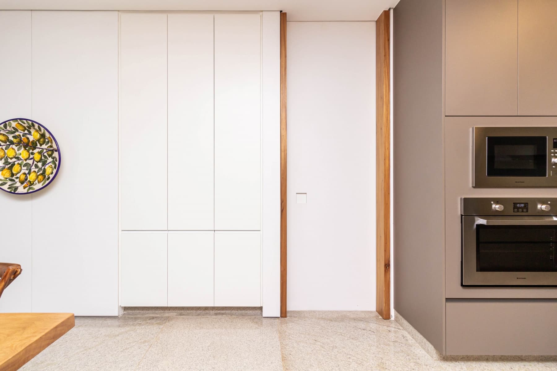 Armários internos em Bianco Nebbia com frentes em Laminato Canapa, puxadores Linea alumínio Nocciola.