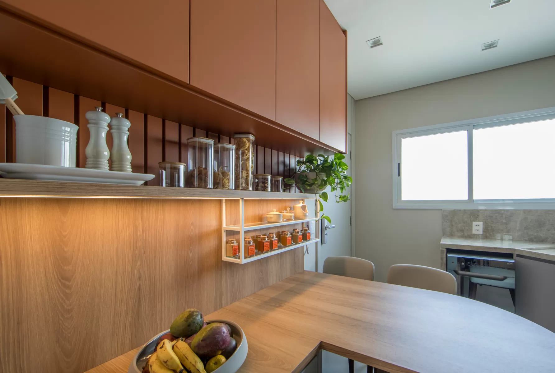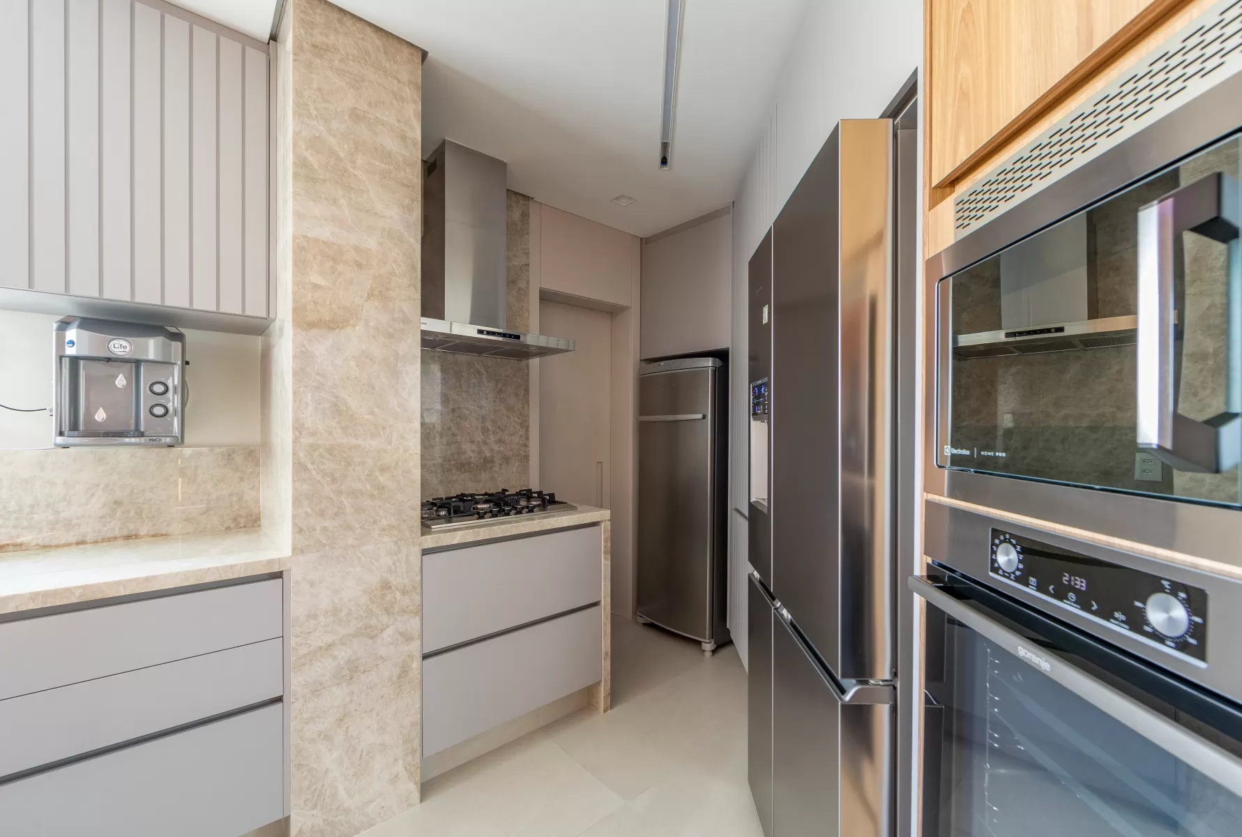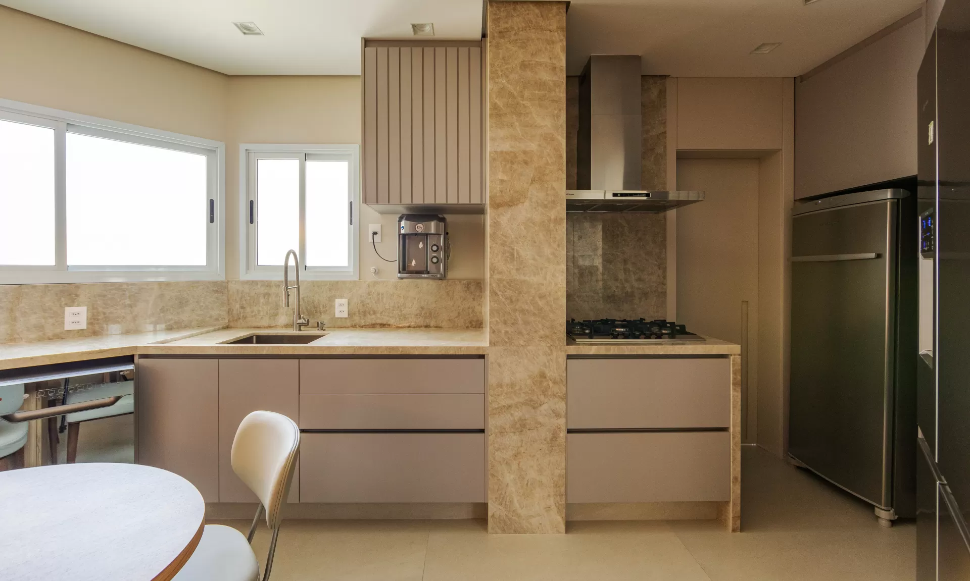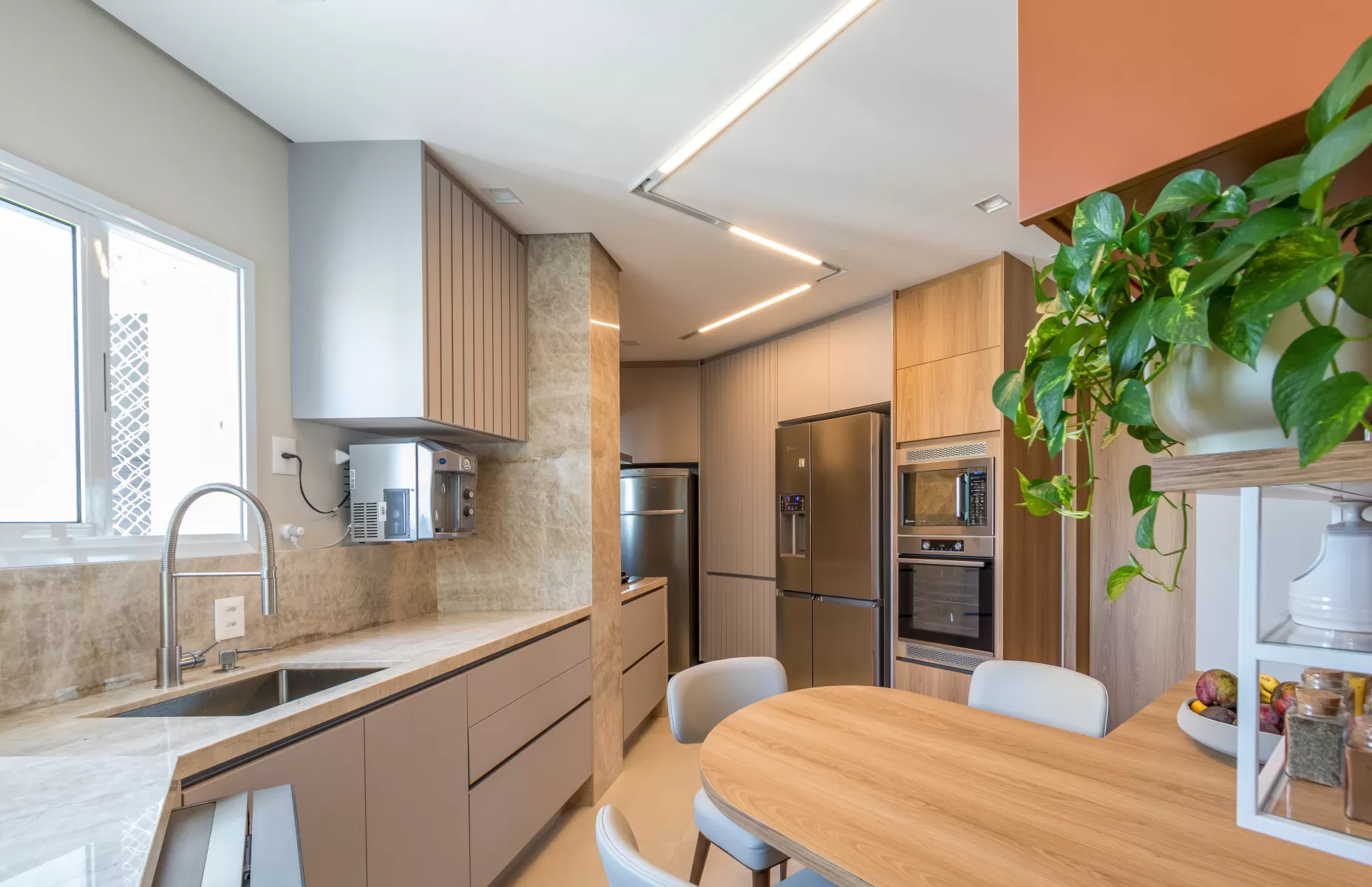 Cozinha com design contemporâneo, unindo estética e funcionalidade em um ambiente sofisticado e bem planejado. Os armários embutidos de linhas retas e tons neutros criam uma composição harmoniosa, enquanto a bancada de pedra adiciona elegância e durabilidade. A iluminação embutida em trilhos reforça a modernidade do espaço, destacando os eletrodomésticos em inox que se integram perfeitamente ao projeto. A mesa de madeira complementa o ambiente, proporcionando um toque acolhedor e convidativo. Uma cozinha onde o design e a praticidade se encontram!