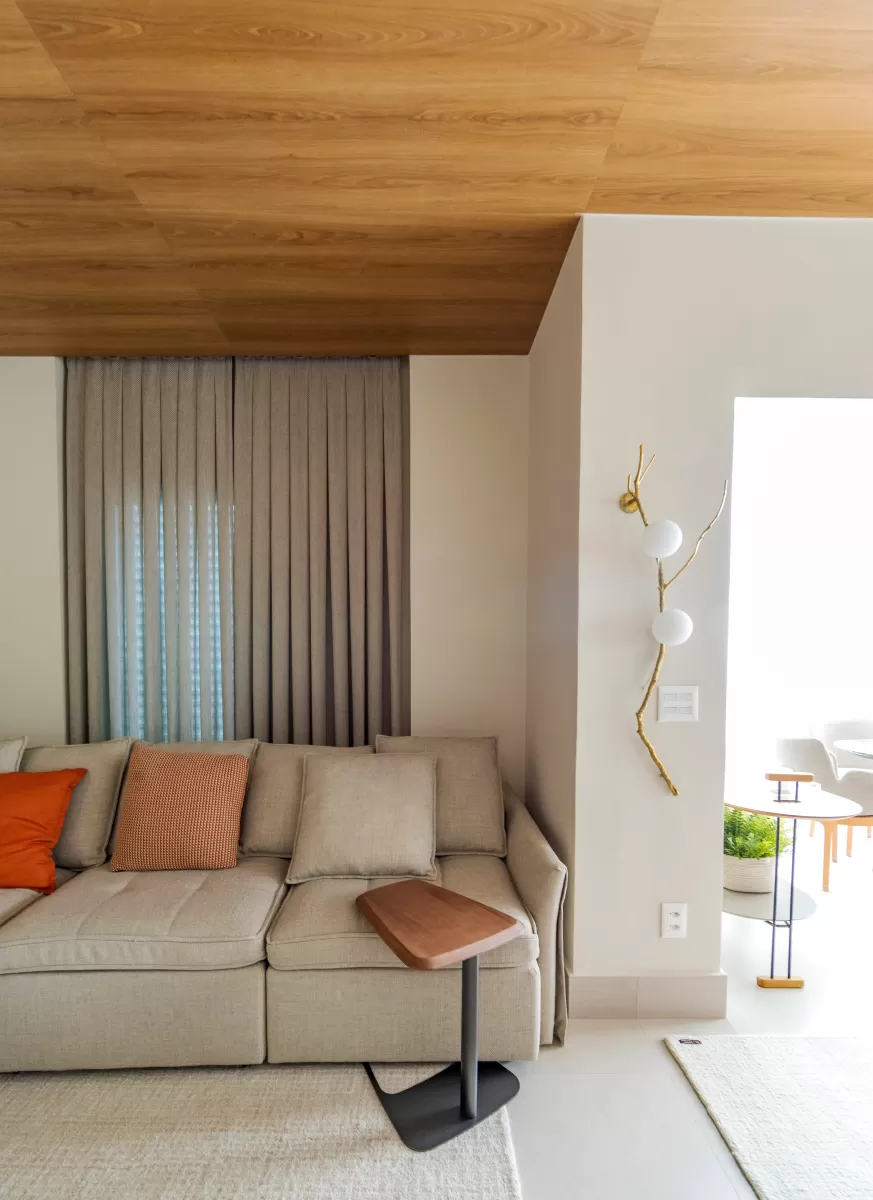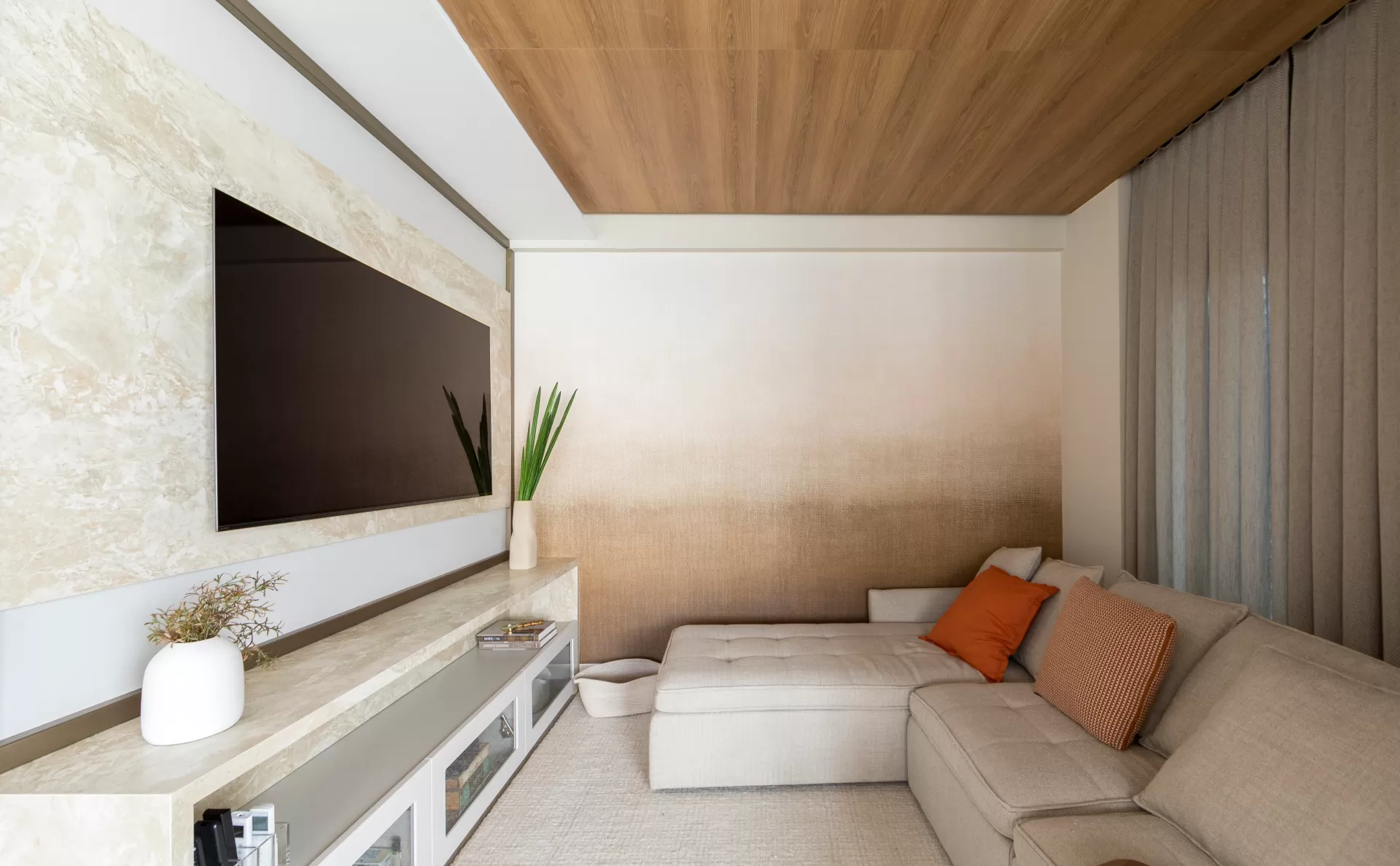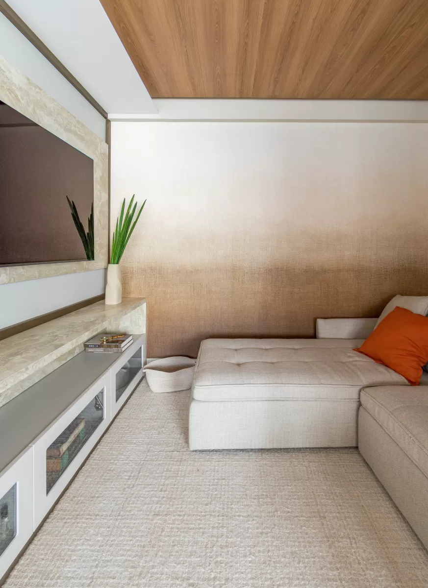 Sala de estar com design contemporâneo, unindo elegância e conforto. O painel de TV em pedra natural adiciona sofisticação, enquanto o teto laminado em madeira traz aconchego e um acabamento moderno. O sofá neutro garante conforto, complementado por almofadas terrosas que aquecem o ambiente. A parede degradê adiciona profundidade, harmonizando com a cortina fluida que suaviza a luz natural. Um espaço acolhedor e sofisticado, perfeito para relaxar!