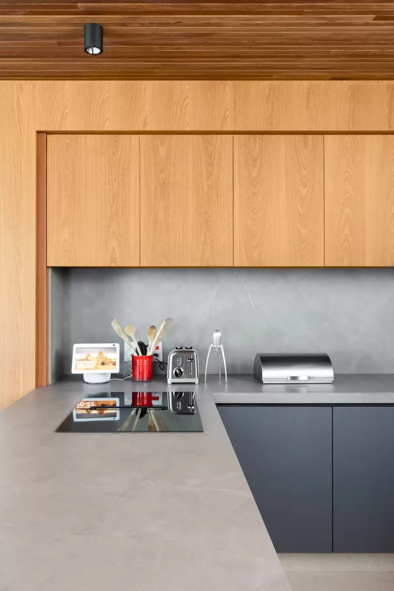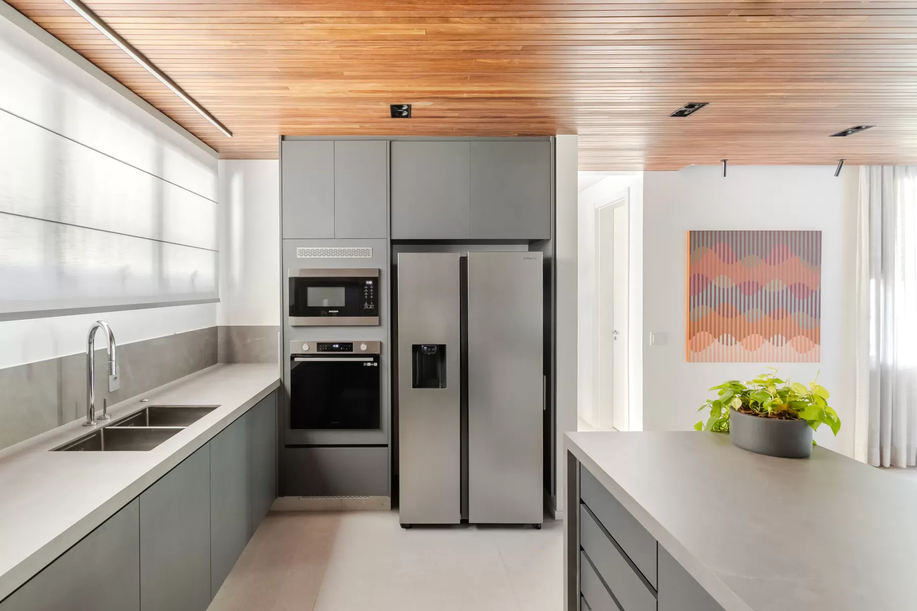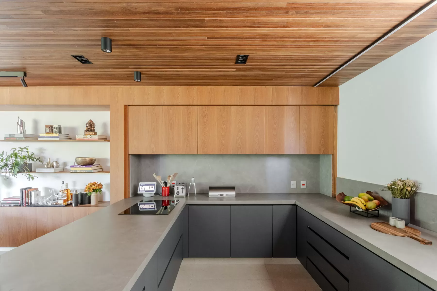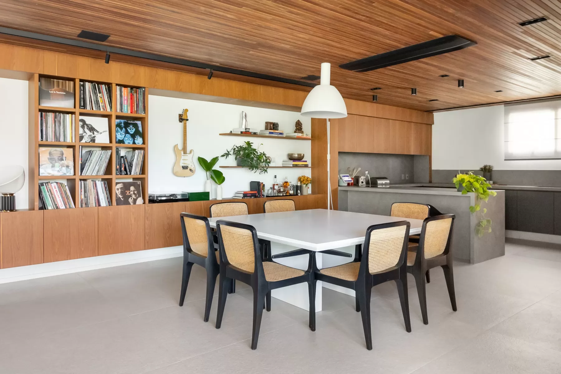 Projeto especial que integra living e cozinha com total fluidez. A estante multifuncional conecta os ambientes, servindo de apoio para livros, discos e até bar, garantindo versatilidade e elegância ao espaço. Nath comenta: -"A principal ideia foi integrar a estante do living, que se estende até a cozinha, criando um único elemento contínuo. A cozinha foi pensada para ser sofisticada e, ao mesmo tempo, um espaço social que se harmoniza com a sala."