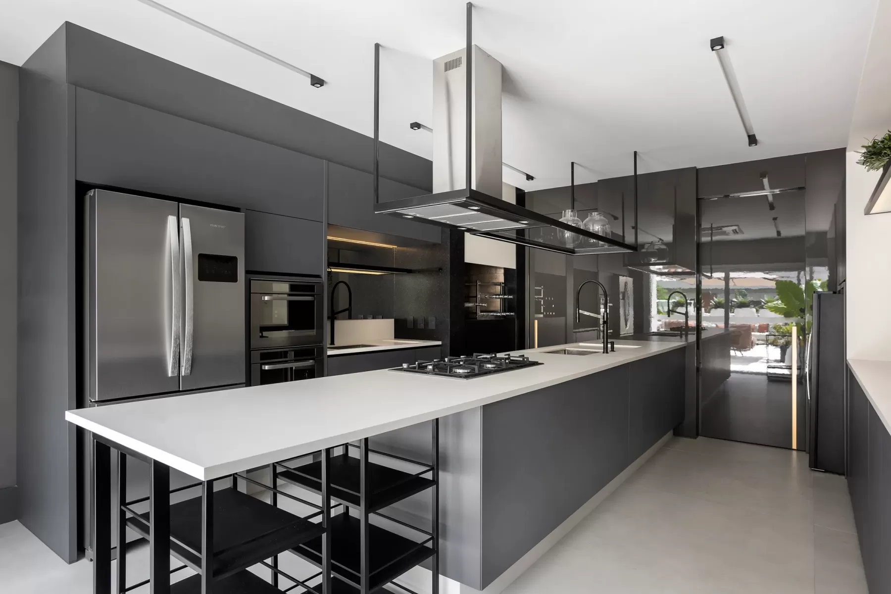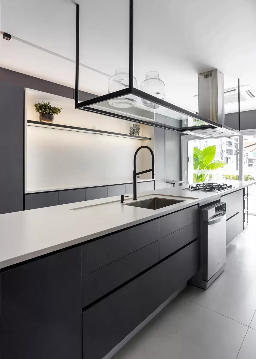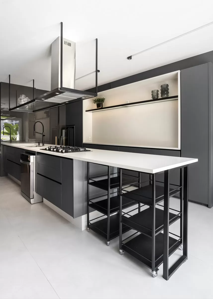 Espaço de apoio para a cozinha do salão de festas, pensando na funcionalidade e com uma grande bancada para preparos, inclusive para atender eventos no condomínio.