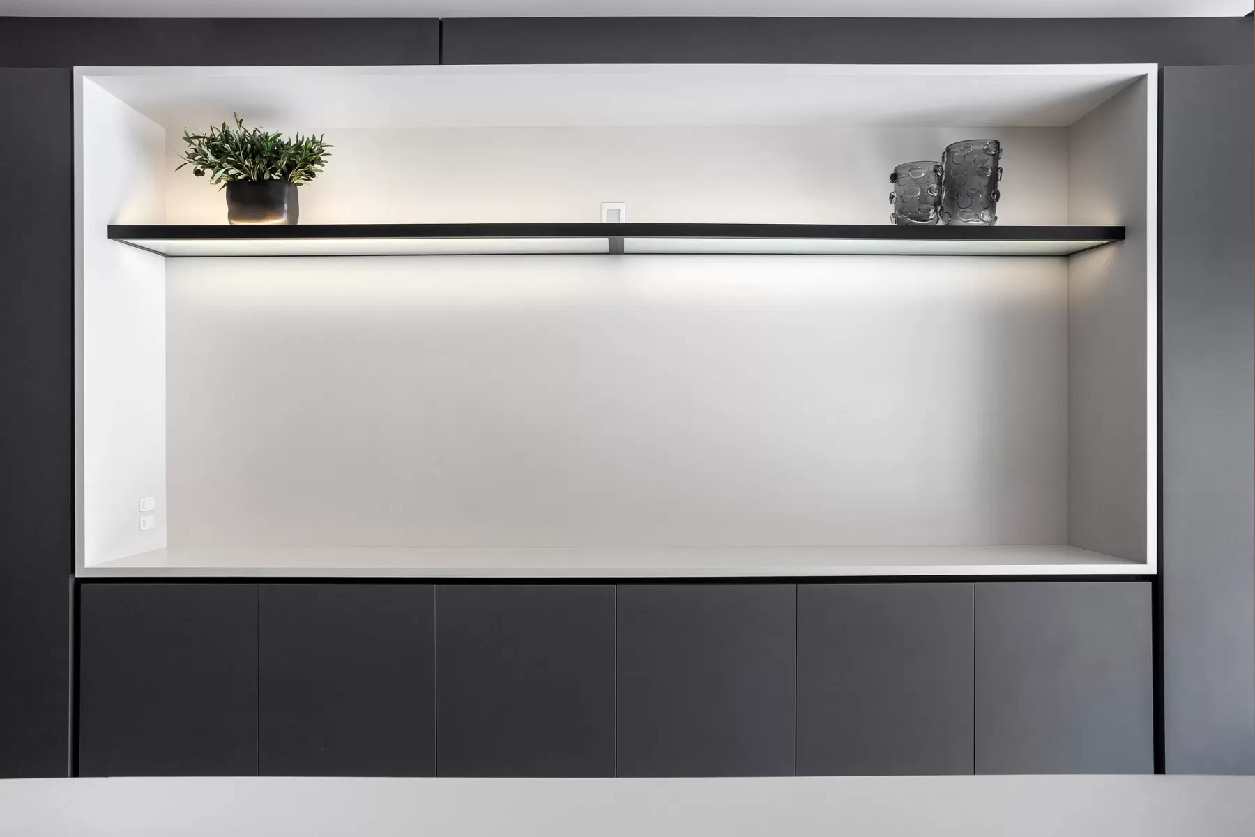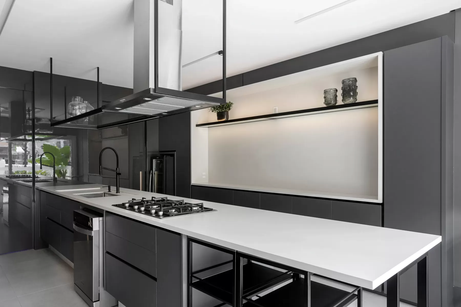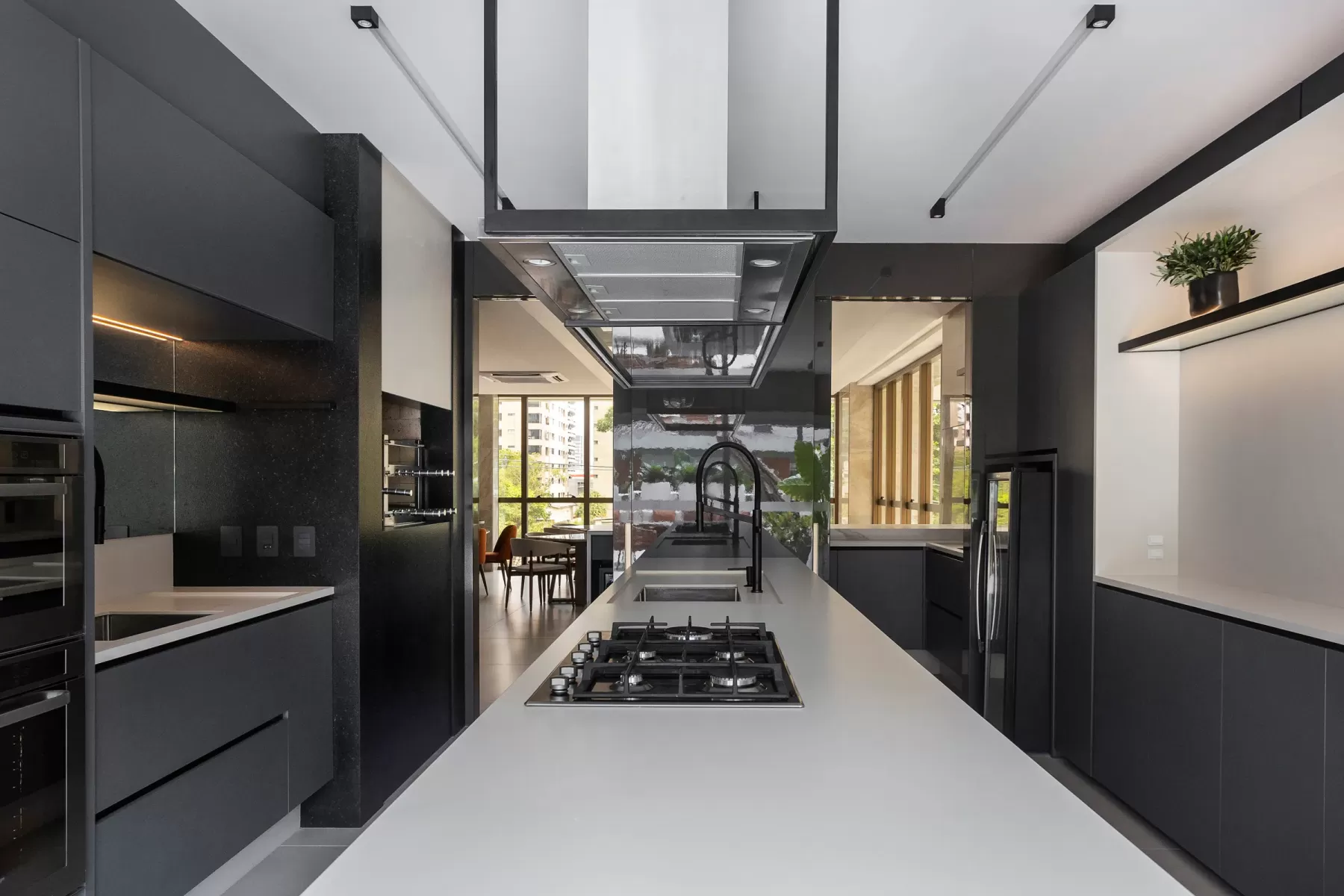 Espaço de apoio para a cozinha do salão de festas, pensando na funcionalidade e com uma grande bancada para preparos, inclusive para atender eventos no condomínio.