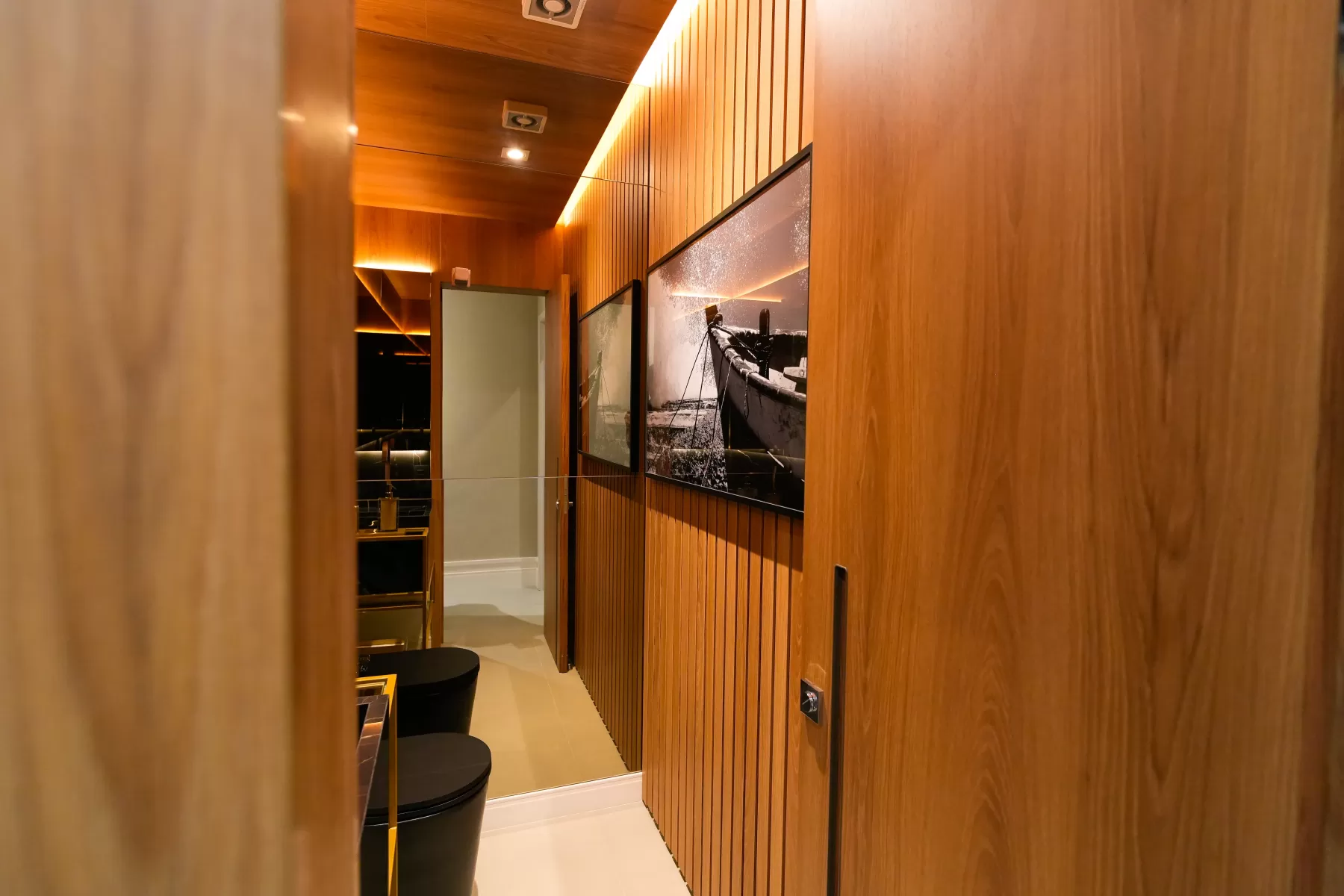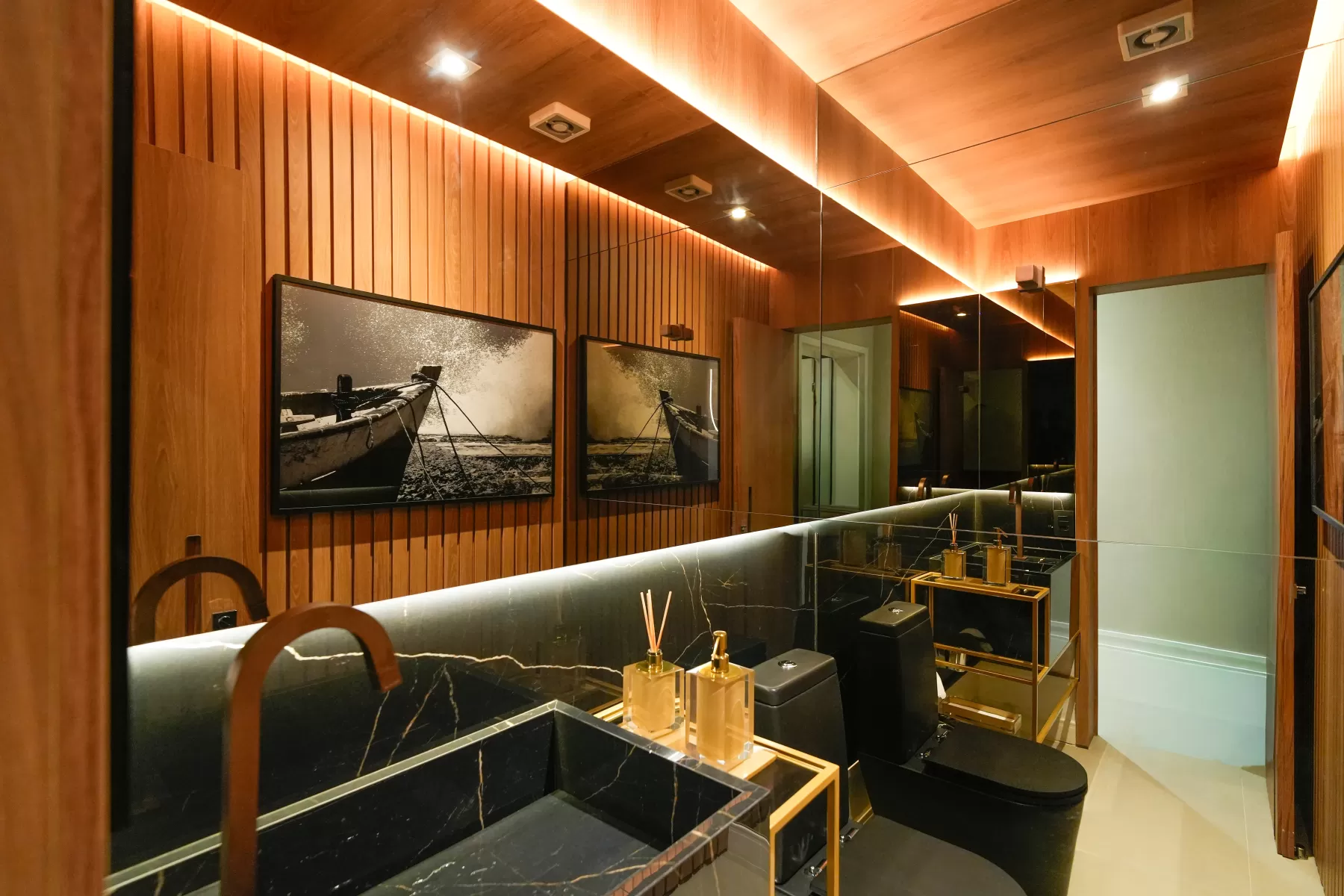 O Lavabo moderno e sofisticado combina elegantemente o amadeirado com o mármore preto e detalhes dourados. O uso extensivo de painéis de madeira nas paredes e no teto cria uma atmosfera acolhedora e suave, contrastando perfeitamente com a imponência do mármore preto. Demonstra que a combinação de texturas naturais transformam um espaço em um ambiente visualmente impactante, além de funcional.