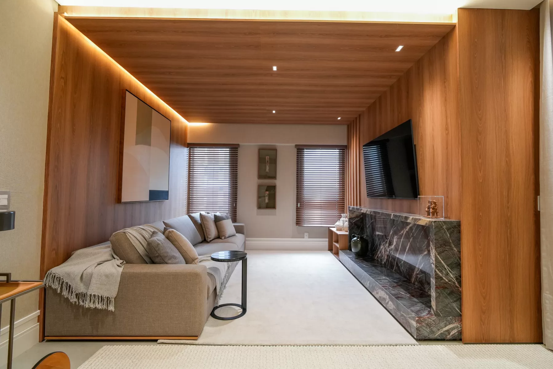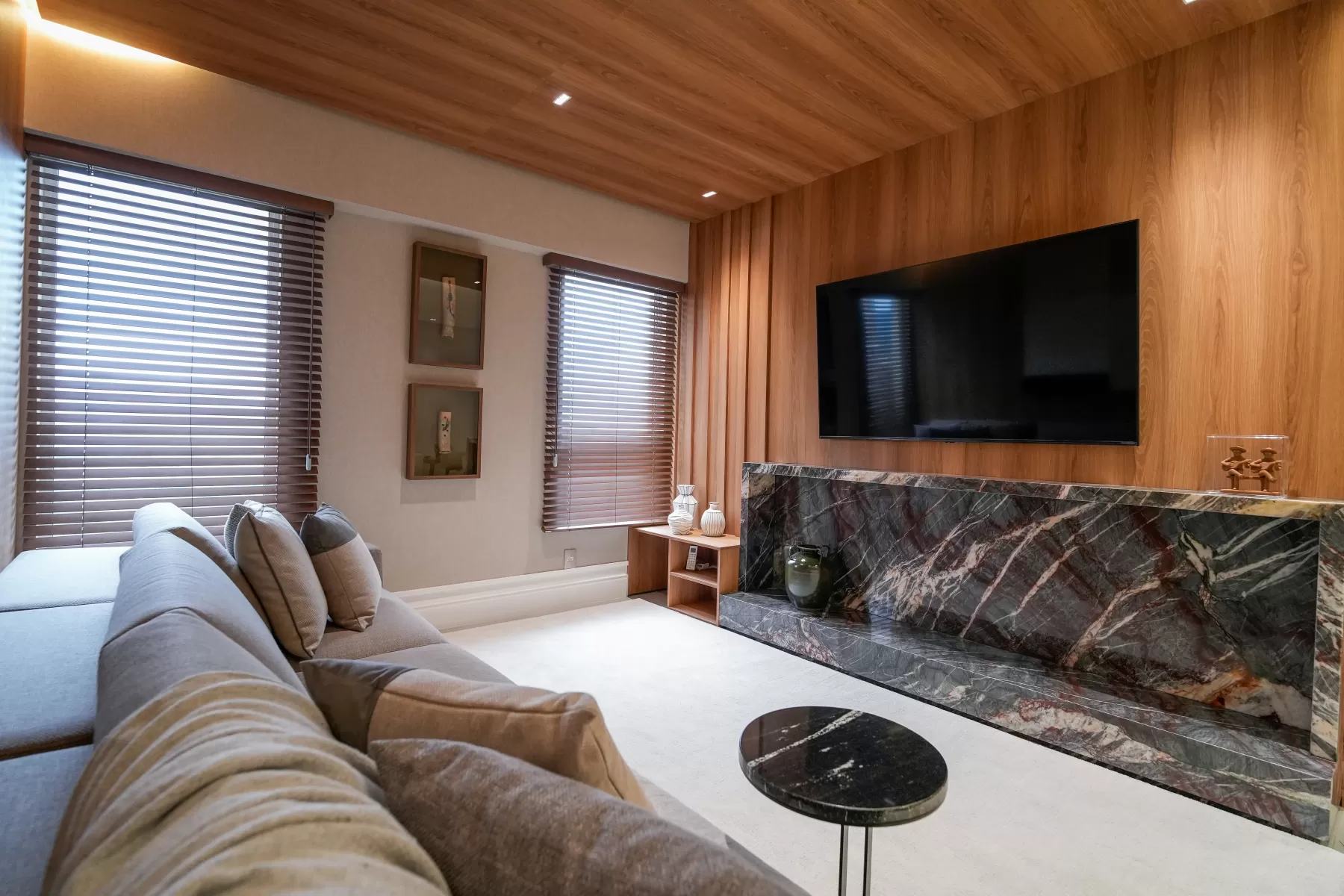 Na sala de TV a Arquiteta mistura a força e a imponência do mármore preto com o aconchego e a textura da madeira em tons claros, uma combinação clássica e atemporal na decoração. Combinação perfeita para criar um espaço elegante e acolhedor.