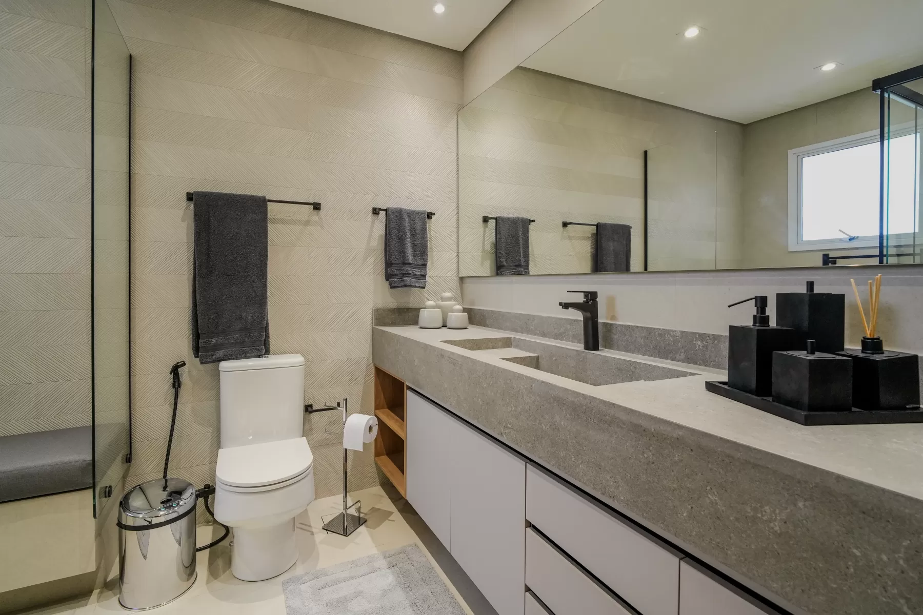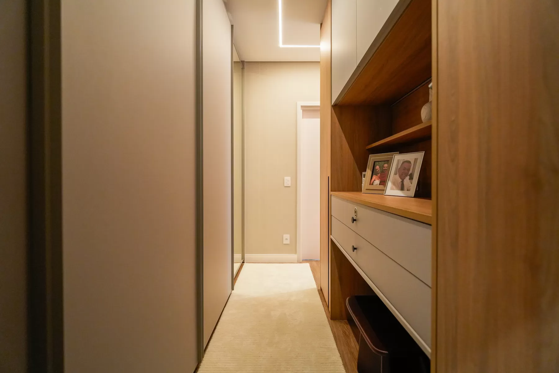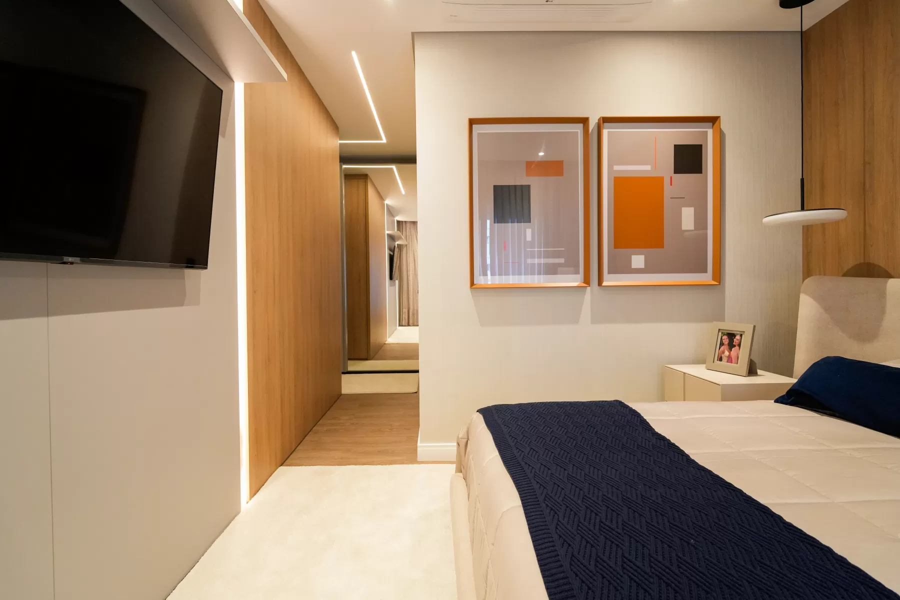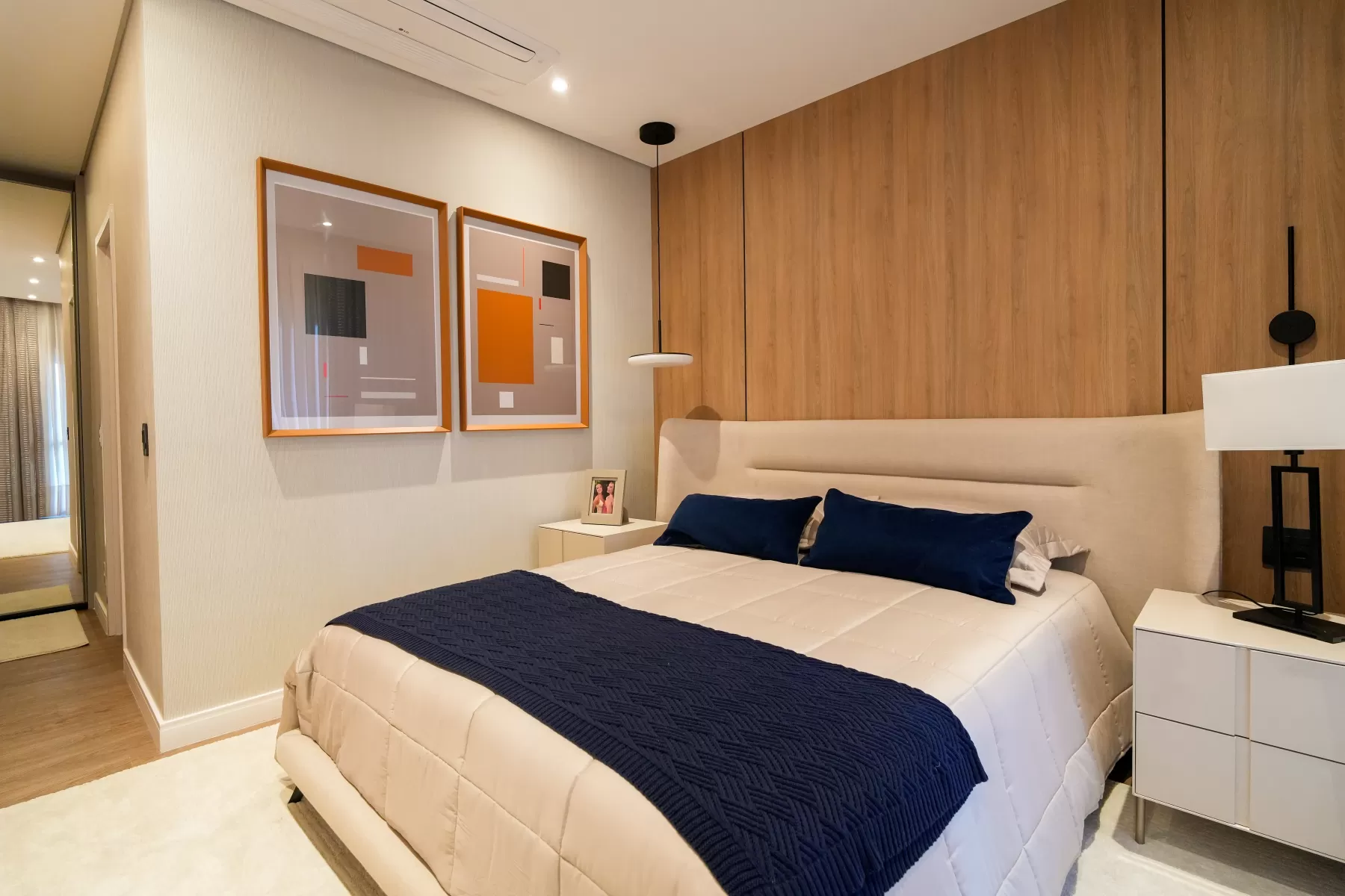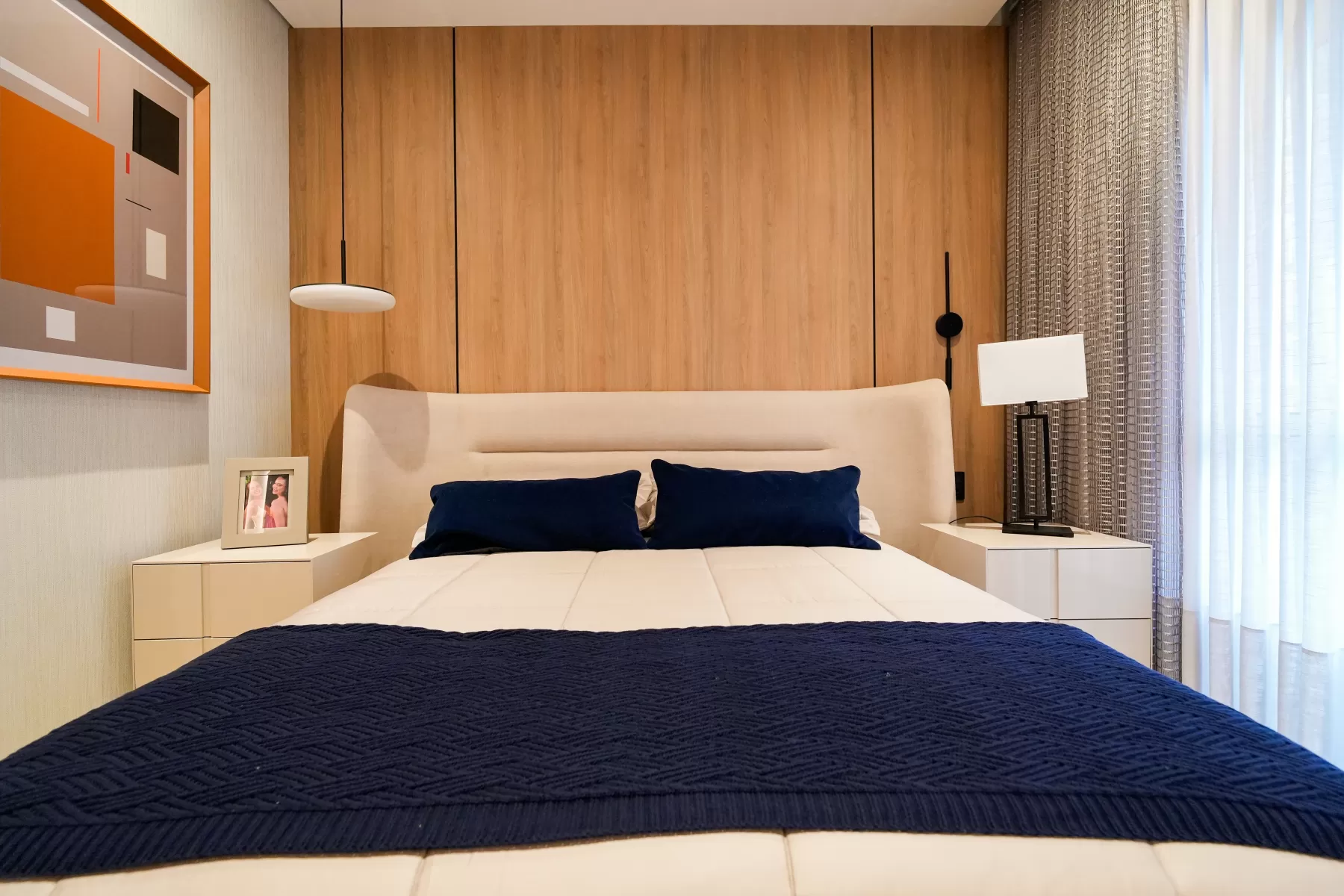 Neste ambiente a Arquiteta aposta em tons suaves e neutros como bege, branco e cinza-claro, que trazem uma sensação de tranquilidade e atemporalidade. O grande painel de madeira na parede adiciona calor e textura ao espaço, combinando perfeitamente com os tons neutros. A cabeceira da cama é estofada contribui para o conforto e a suavidade do ambiente