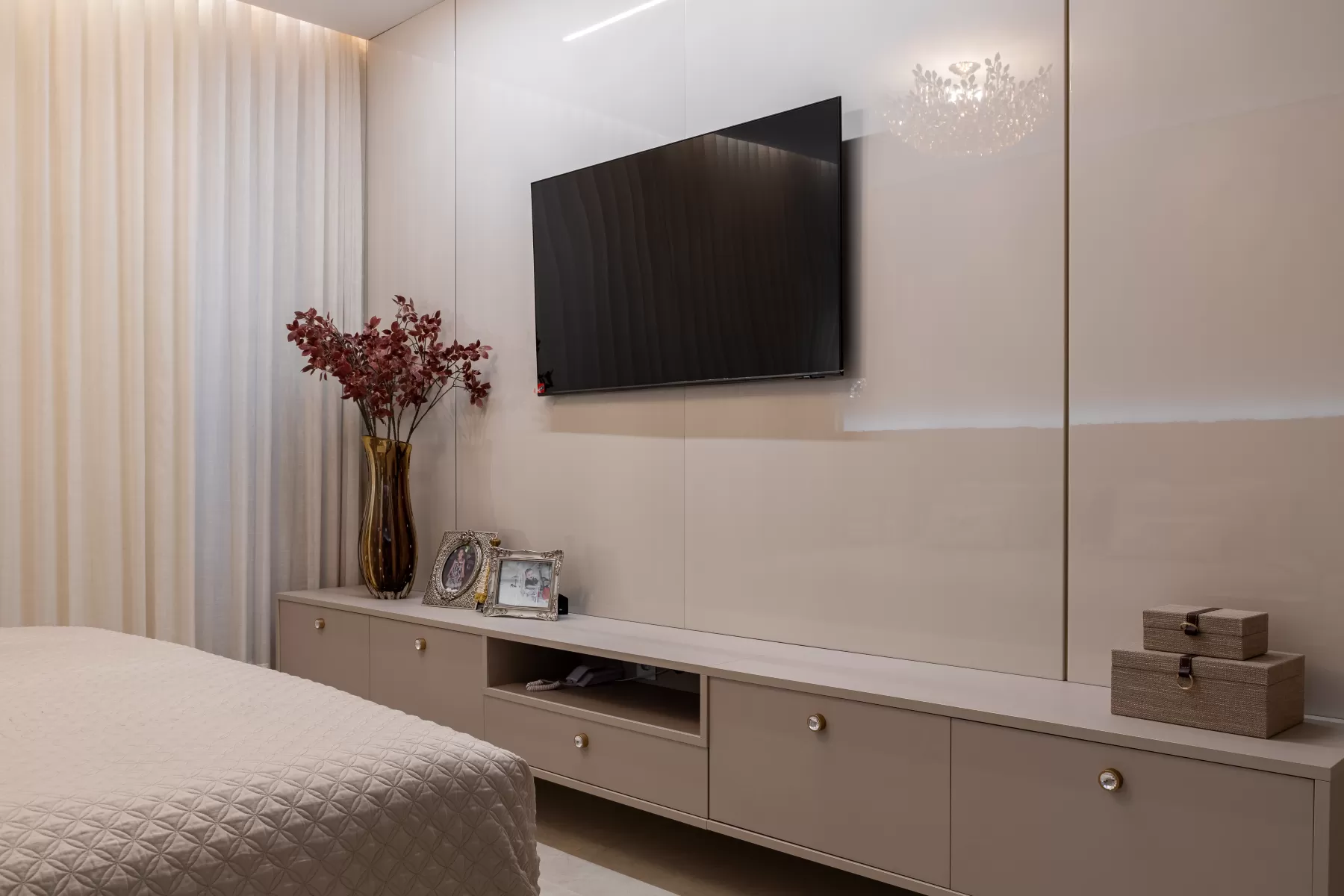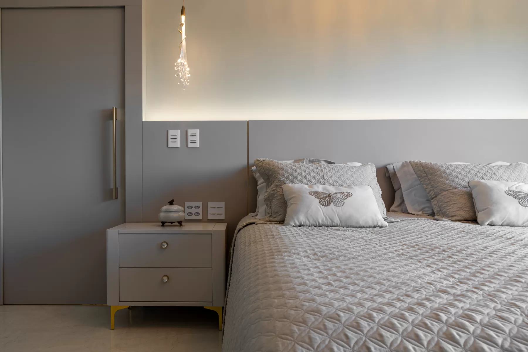 O dourado nunca sai de moda e nessa suite ele é o protagonista! O puxador Paio Granado da Bontempo com Laminato Nude confere um toque de sofisticação e exclusividade a cada detalhe para o Closet. A iluminação estratégica valoriza cada peça, transformando o closet em um verdadeiro templo da moda. Para as gavetas do Banheiro e Quarto utilizamos o Radio Diamond Dourado que é um verdadeiro diamante e trouxe esse toque sofisticado para os ambientes. Personalize seu espaço com a Bontempo e viva a experiência de ter uma Suite completa dos sonhos.