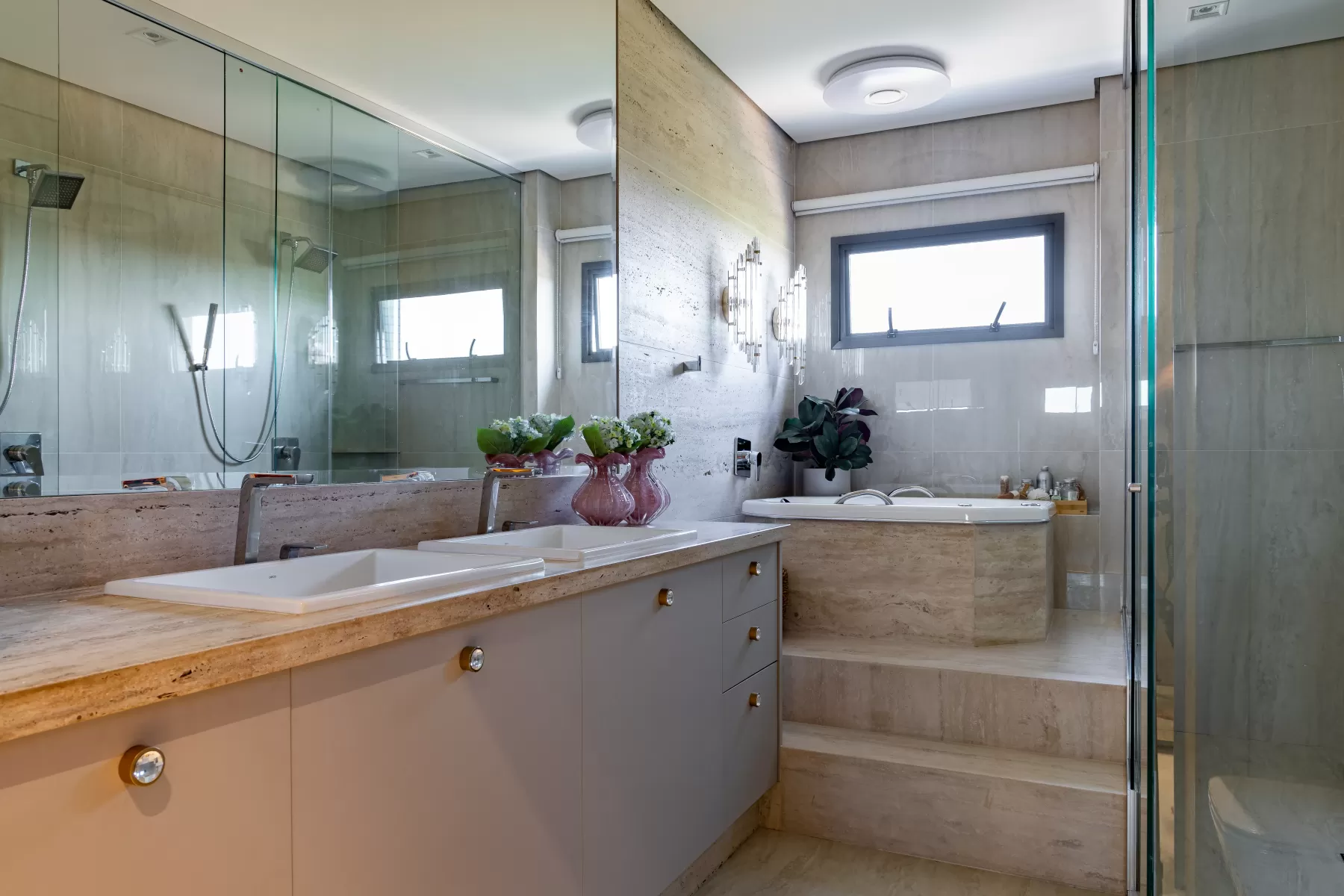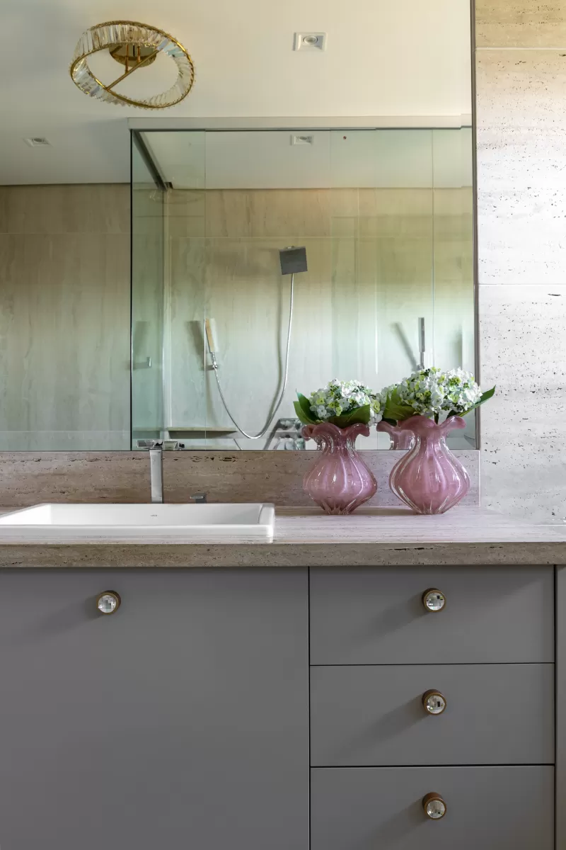 O dourado nunca sai de moda e nessa suite ele é o protagonista! O puxador Paio Granado da Bontempo com Laminato Nude confere um toque de sofisticação e exclusividade a cada detalhe para o Closet. A iluminação estratégica valoriza cada peça, transformando o closet em um verdadeiro templo da moda. Para as gavetas do Banheiro e Quarto utilizamos o Radio Diamond Dourado que é um verdadeiro diamante e trouxe esse toque sofisticado para os ambientes. Personalize seu espaço com a Bontempo e viva a experiência de ter uma Suite completa dos sonhos.