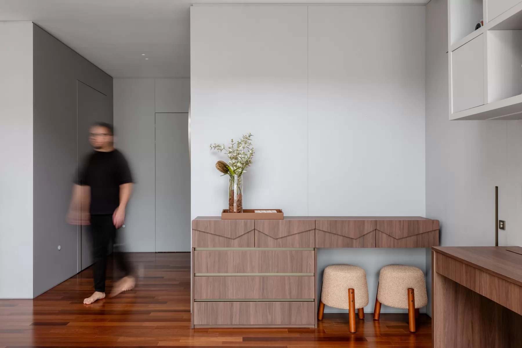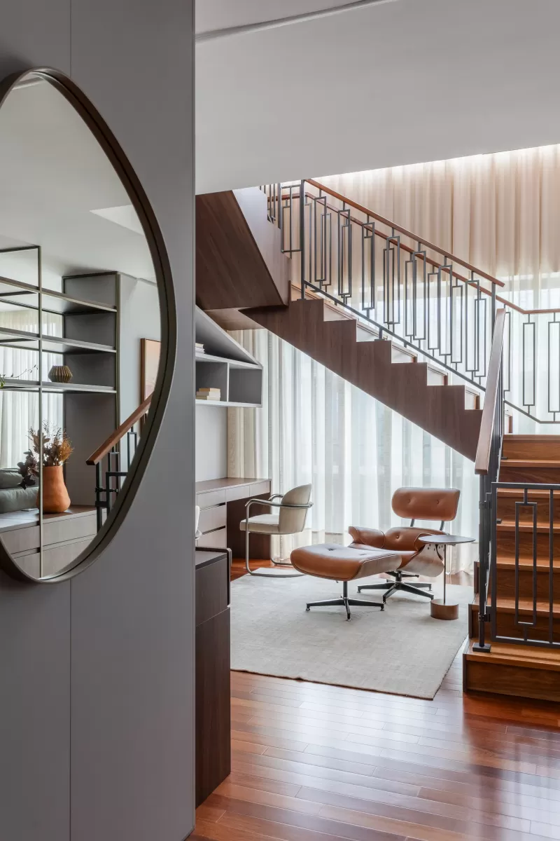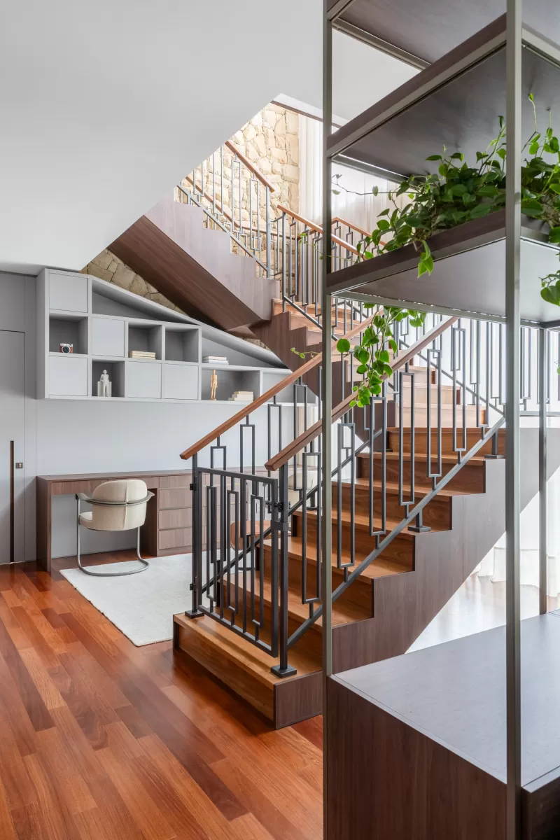 Este projeto nasce do encontro entre luz, calma e matéria. A madeira, em suas tramas e profundidades, conduz o olhar e envolve cada ambiente com uma sensação de abrigo. Tecidos suaves, tons terrosos e gestos delicados de cor criam uma narrativa silenciosa, onde tudo respira harmonia. Na cozinha, o verde oliva se abre como um sopro de frescor; na escada, a madeira e o metal desenham um movimento quase coreografado. Cada espaço é pensado para acolher, com leveza, elegância e a beleza serena que só a simplicidade bem resolvida pode revelar.