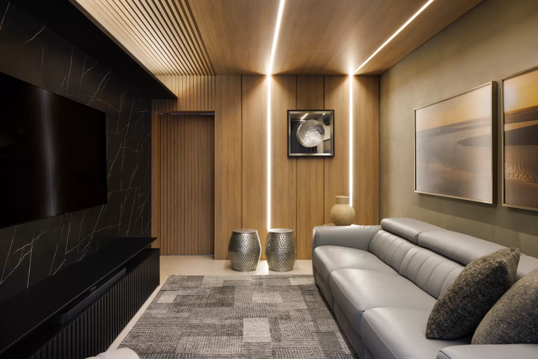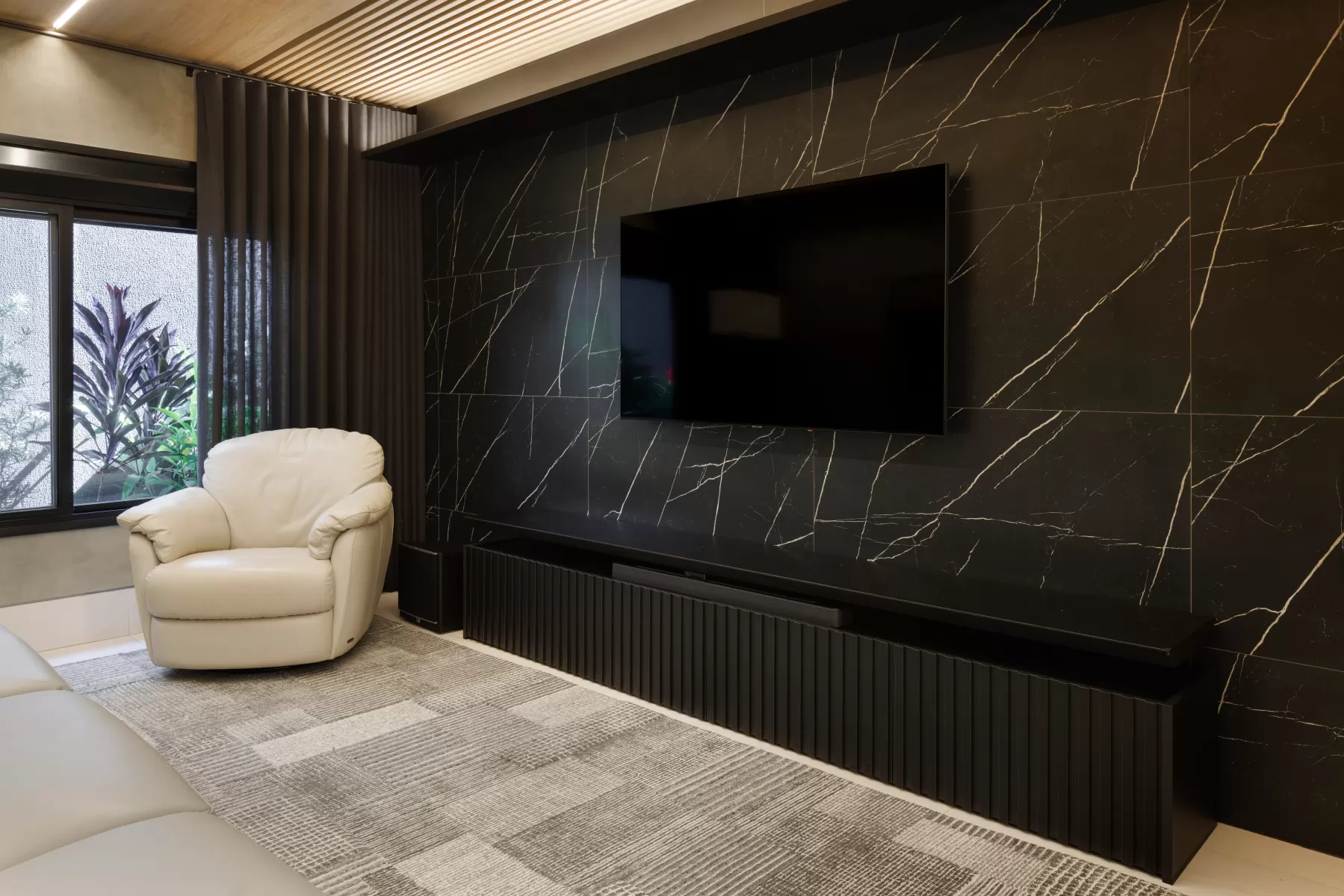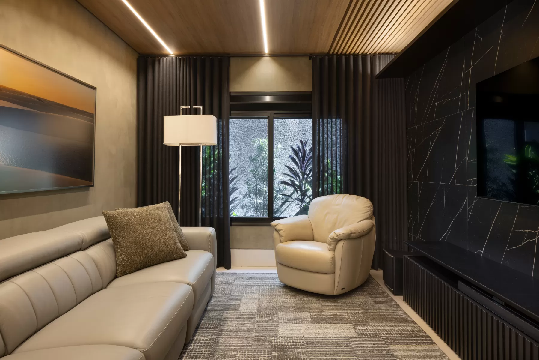 Todo estar social, espaço gourmet, varanda e piscina privilegiam essa contemplação direta com o externo. A escolha dos materiais foi algo fundamental na composição atemporal e sofisticada de um luxo com propósito.