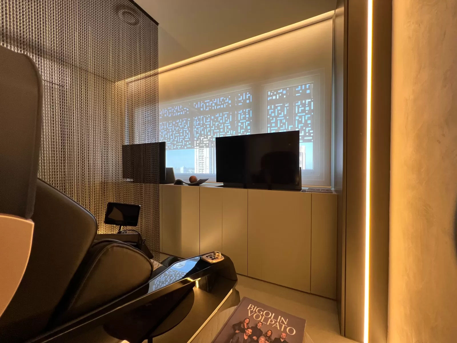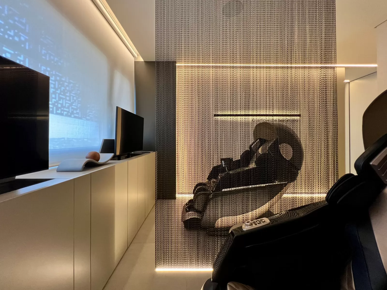 A sala de relaxamento é projetada para proporcionar um ambiente agradável e acolhedor, onde os pacientes podem desfrutar de momentos de tranquilidade e conforto. Equipado com poltronas massageadoras de última geração, o espaço é ideal para aliviar o estresse e promover o bem-estar. A iluminação suave e indireta cria uma atmosfera serena, permitindo que os pacientes relaxem completamente. Cada poltrona é estrategicamente posicionada para oferecer privacidade e conforto, e cada paciente tem acesso a uma tela de TV individual, permitindo uma experiência de relaxamento personalizada