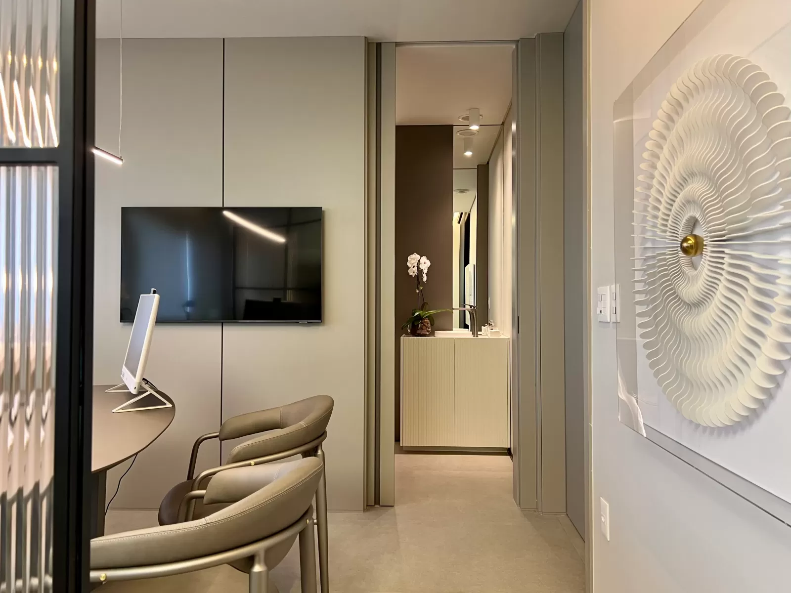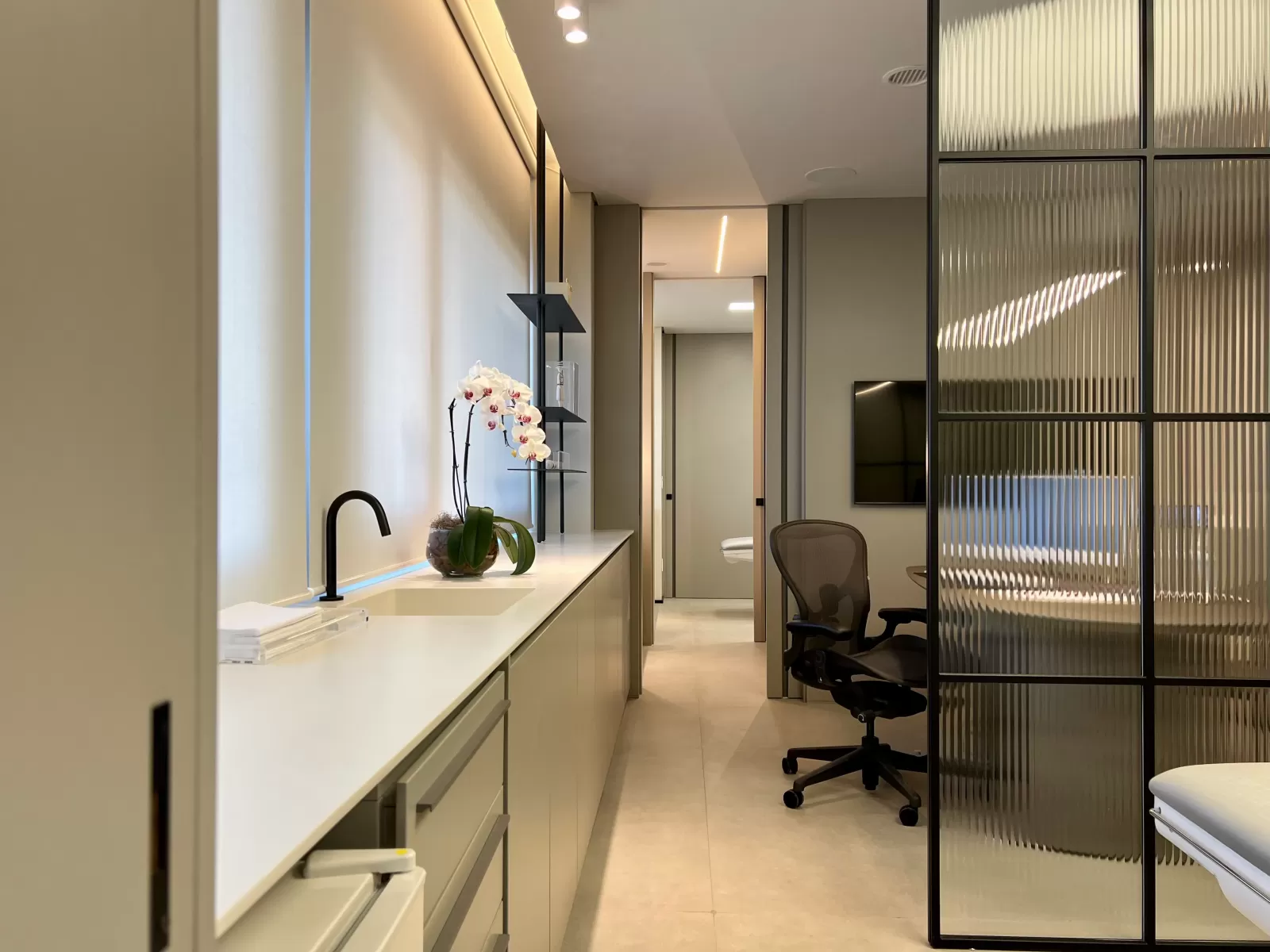 Com design minimalista e contemporâneo, os consultórios aliam sofisticação e funcionalidade para proporcionar um ambiente de atendimento único e personalizado, refletindo a dedicação à excelência em cada detalhe. O ambiente foi pensado para promover uma experiência de atendimento excepcional, desde o primeiro contato até o final da consulta.